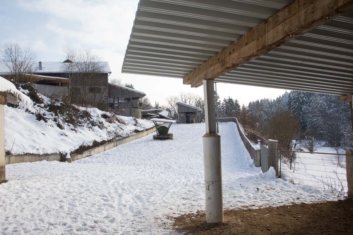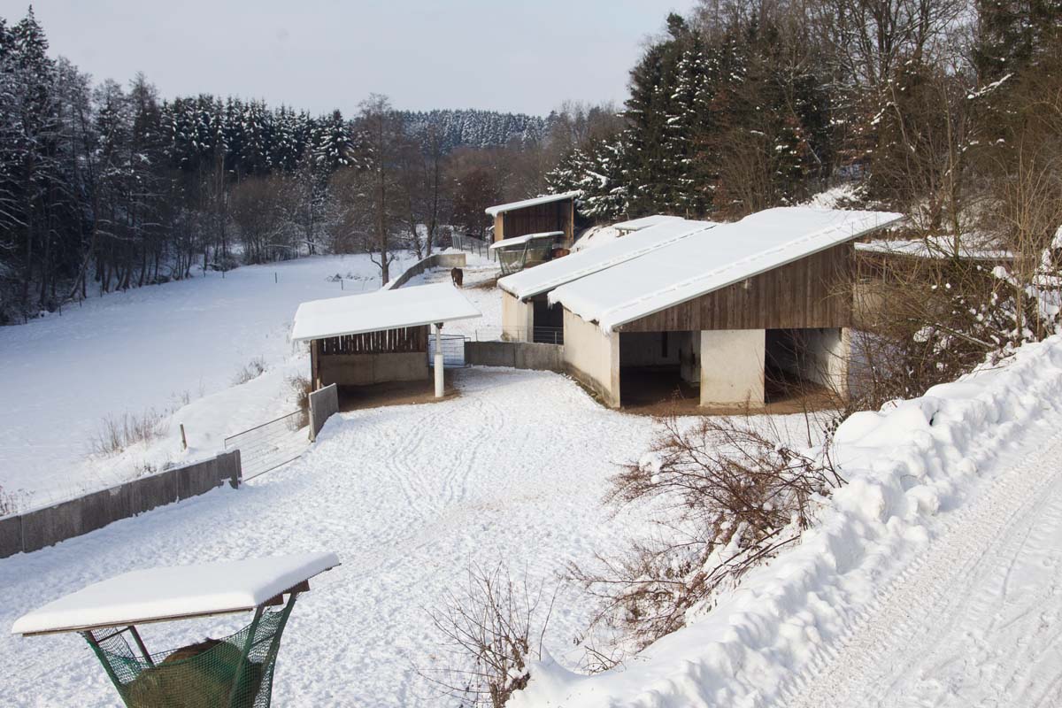 Die beheizte Wassertränke ist "weit weg". Durch die Hanglage ist der Weg zur Tränke zudem ein gesundes Training (siehe hier).