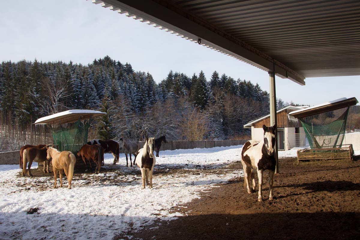 Drei Heuraufen mit Netz laden, mit ausreichend Abstand voneinander, zum "ALL-YOU-CAN-EAT" ein. Mittlerweile versorgt der Glockenhof seine Pferde