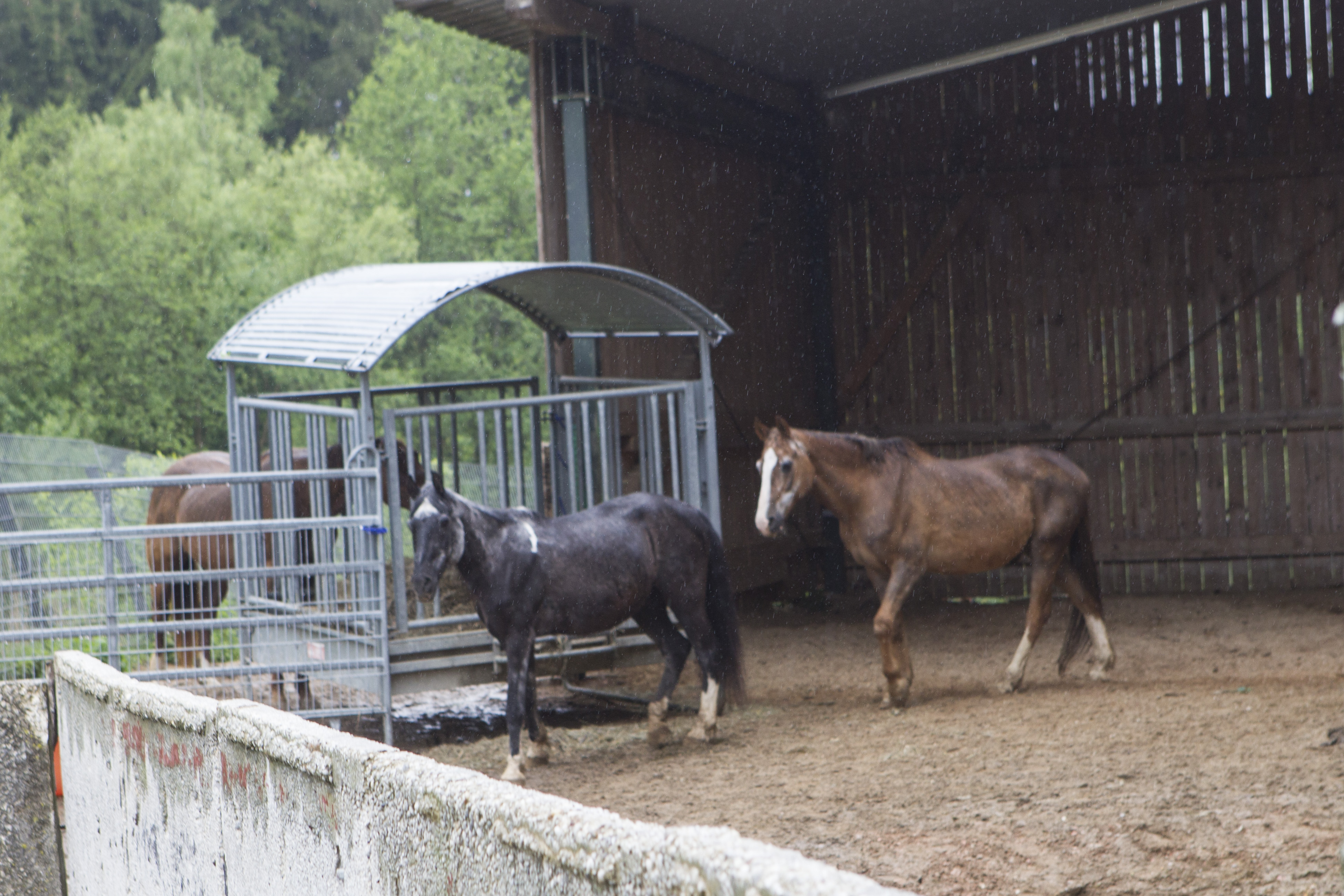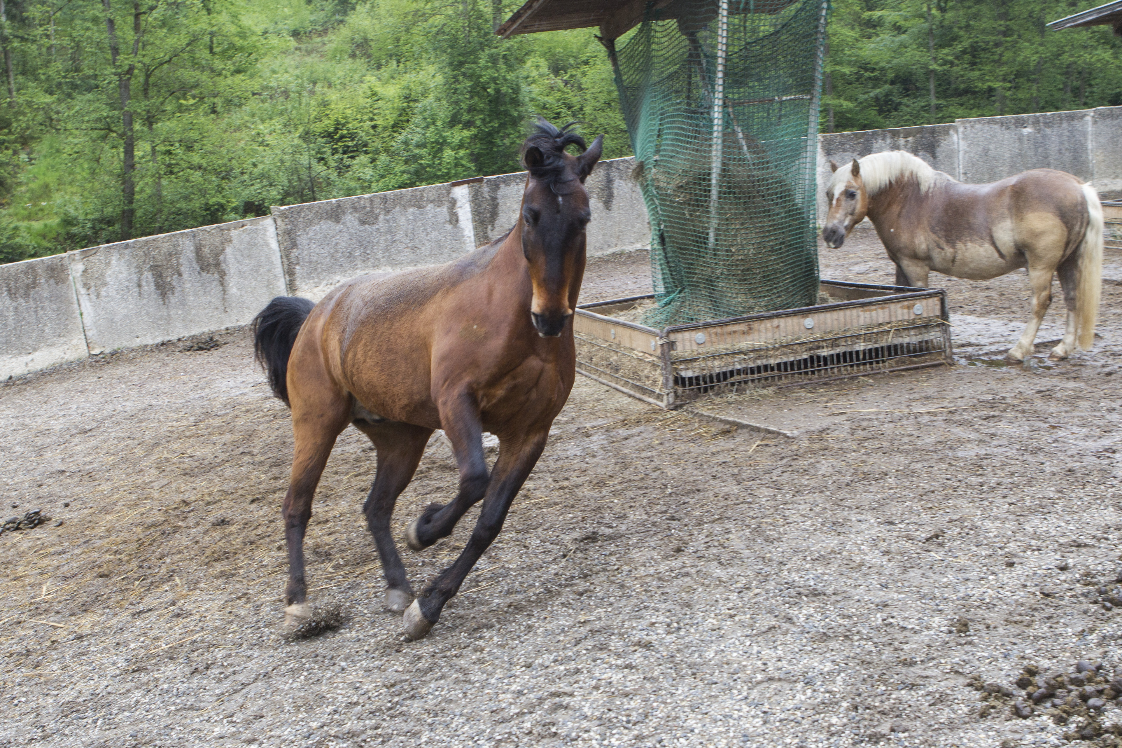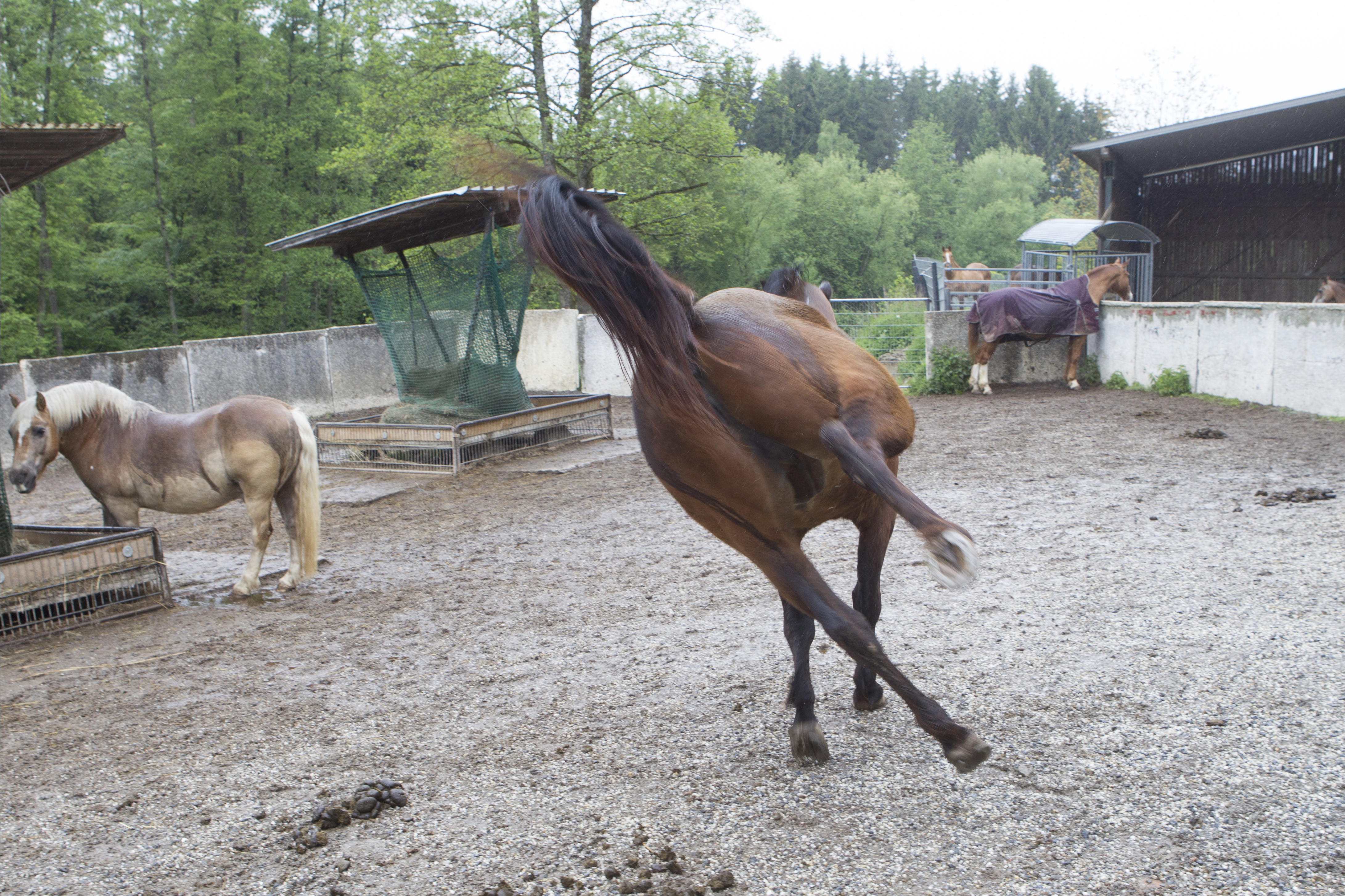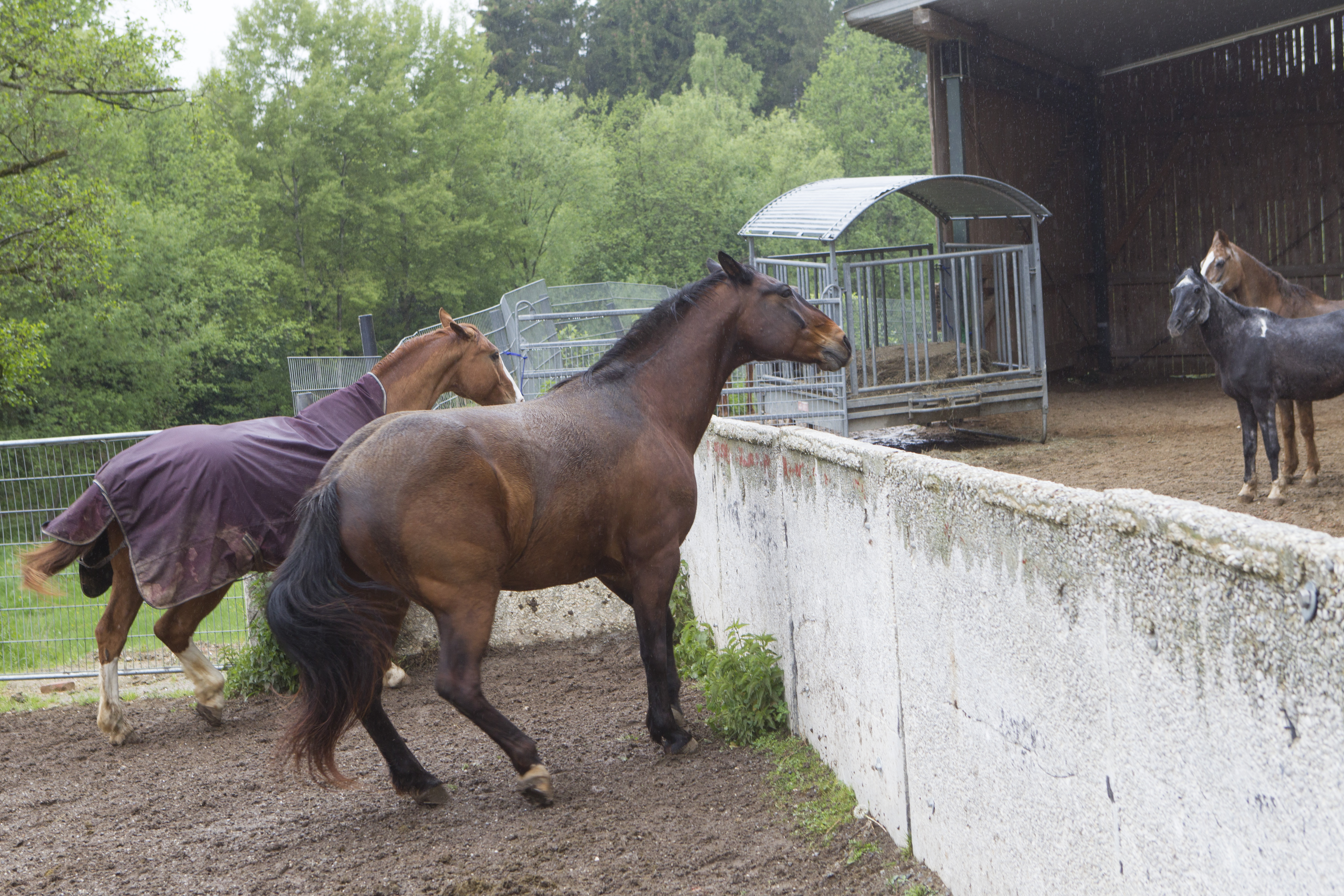 Anfang Mai siedelten nun zu den beiden Seniorinnen zwei Wallache über. Sie bekommen Heulage ohne Netz. In der angrenzenden Allergikerherde sorgte das vor allem bei Teja für Aufregung. Doch seht selbst ...!