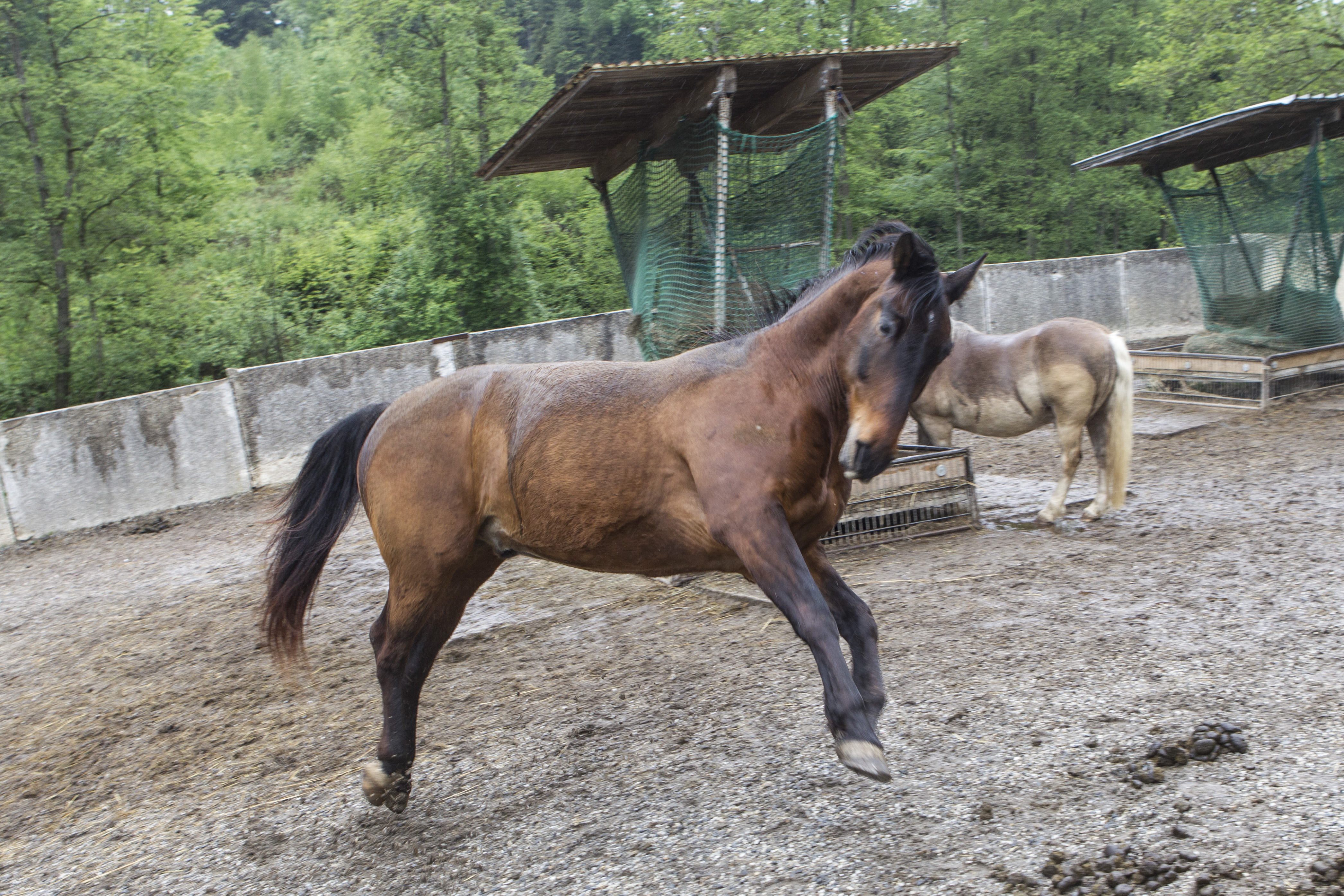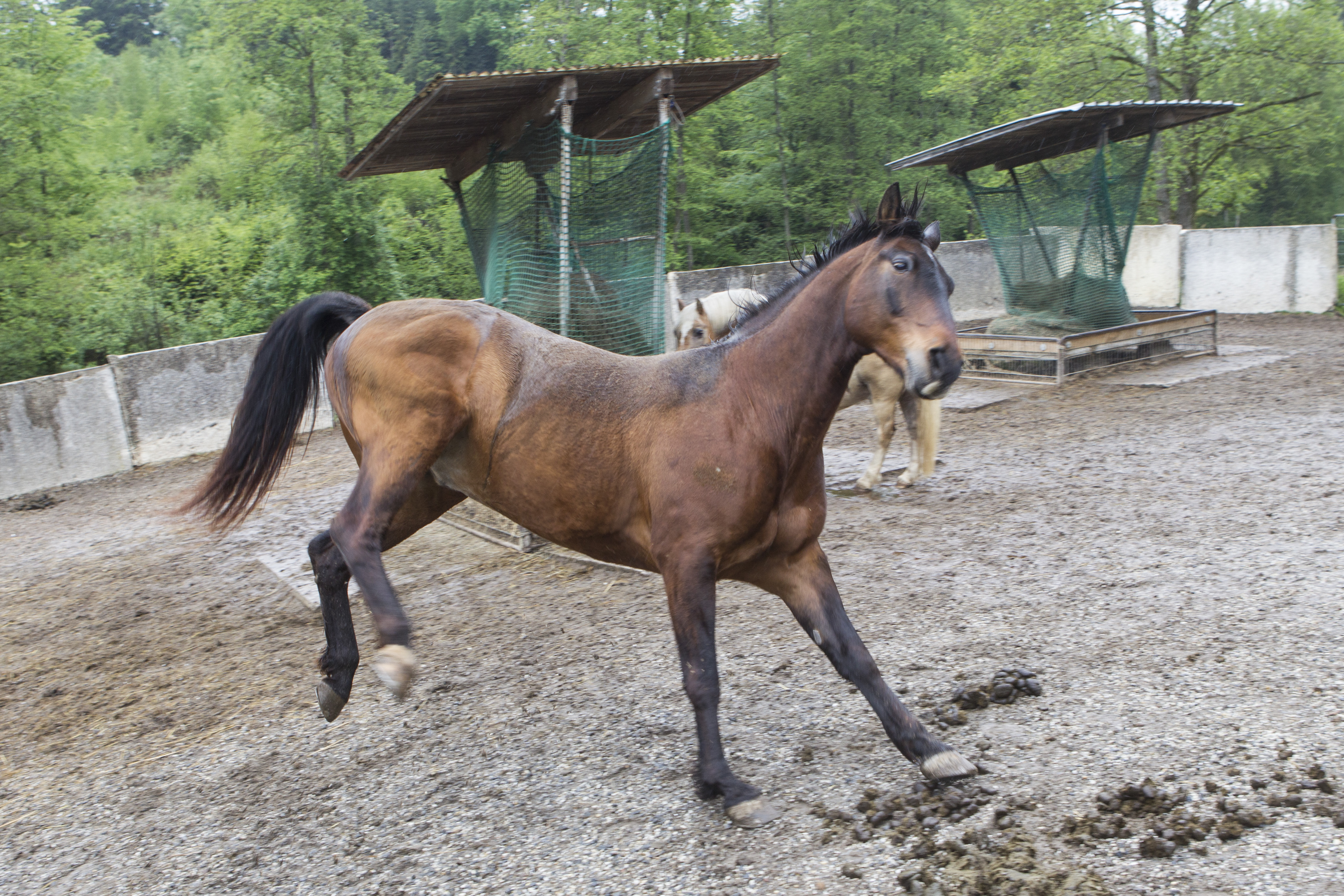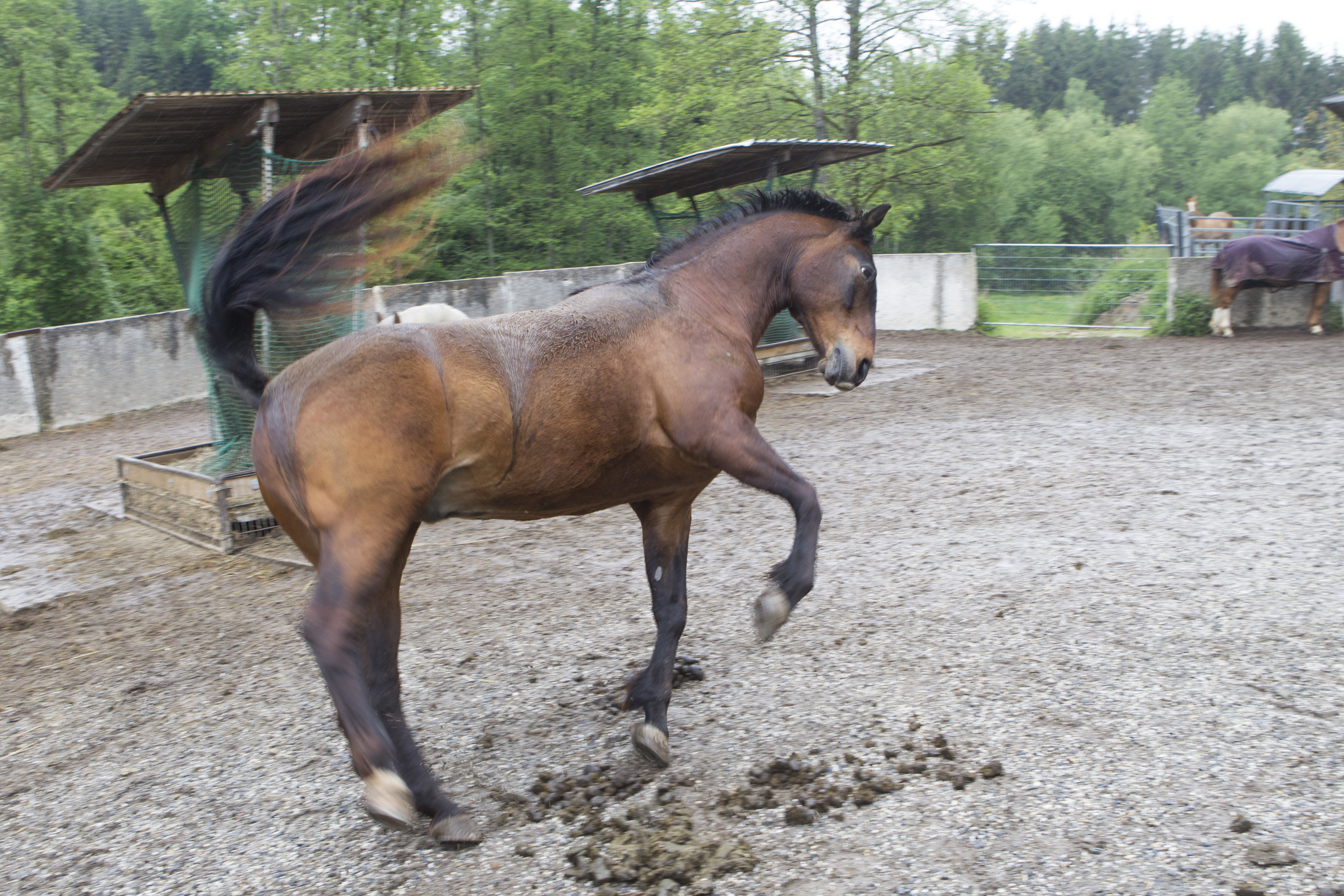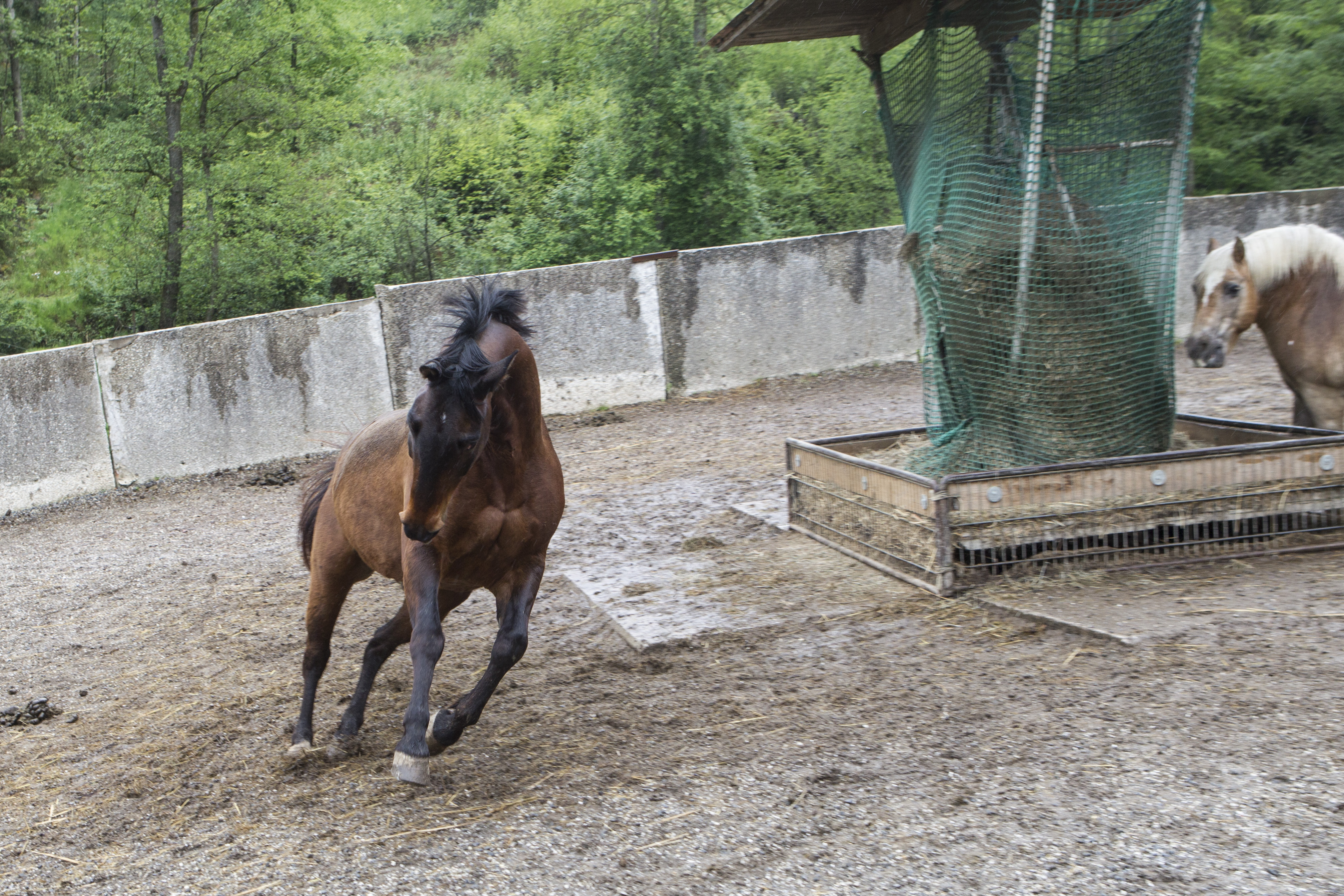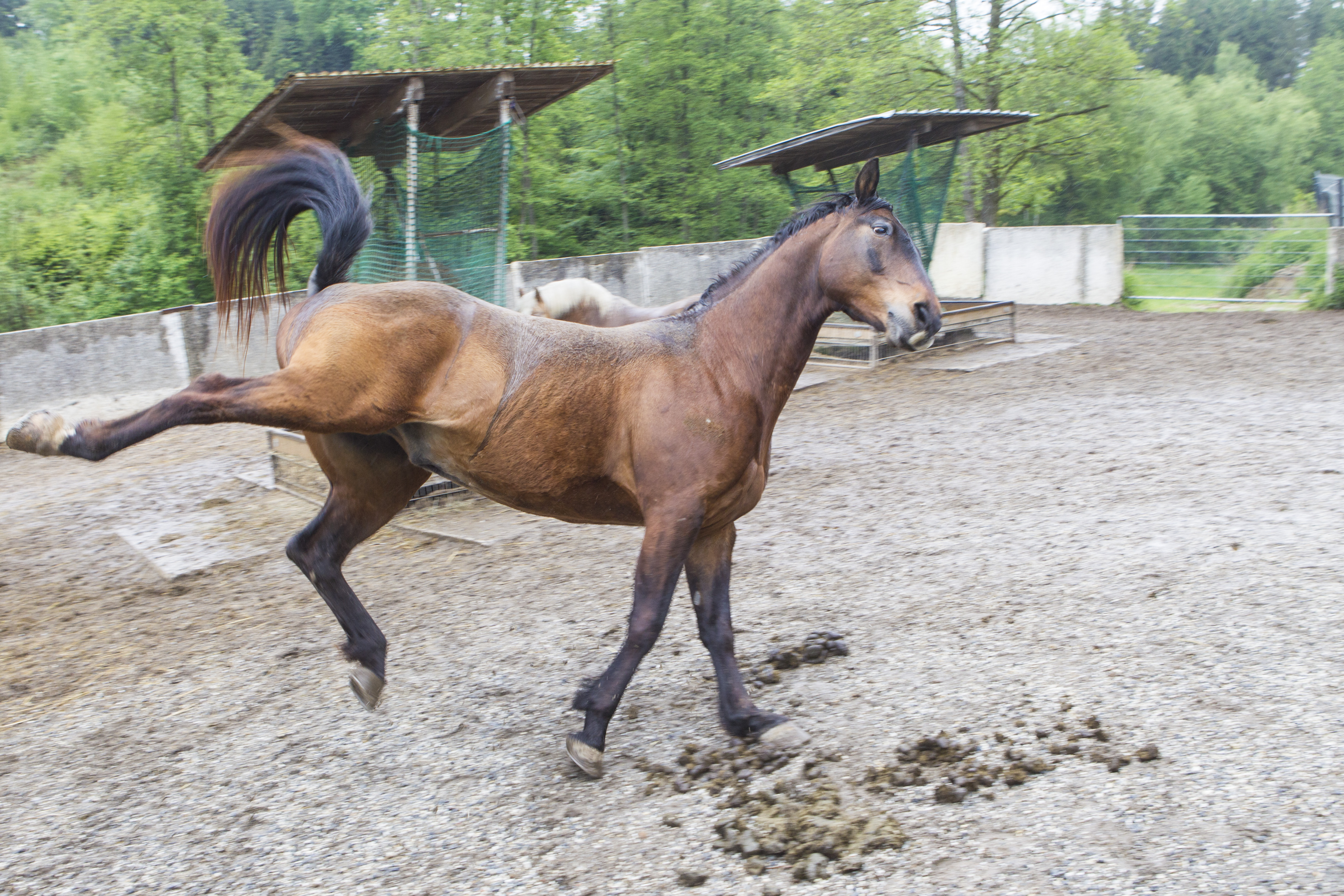 Anfang Mai siedelten nun zu den beiden Seniorinnen zwei Wallache über. Sie bekommen Heulage ohne Netz. In der angrenzenden Allergikerherde sorgte das vor allem bei Teja für Aufregung. Doch seht selbst ...!