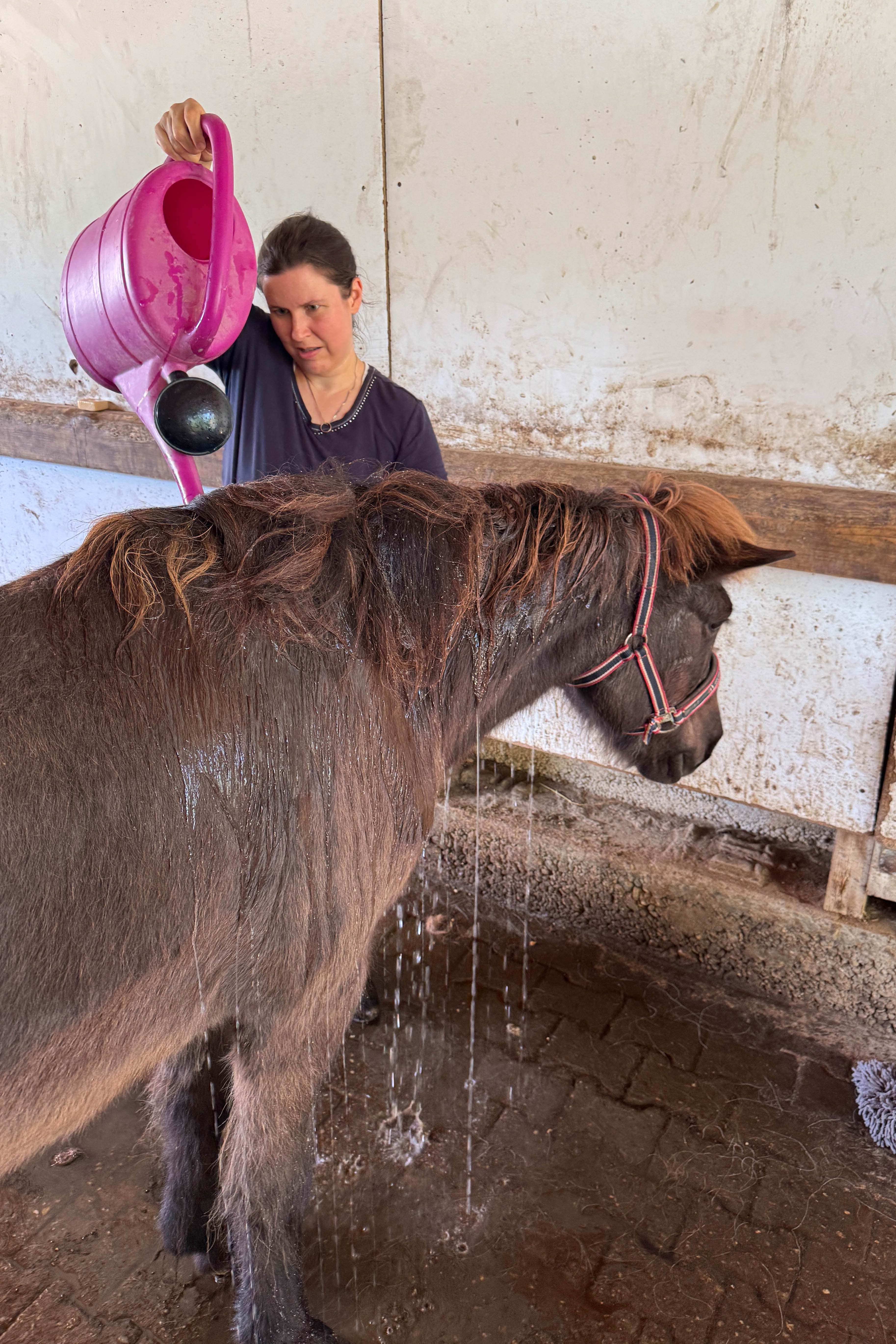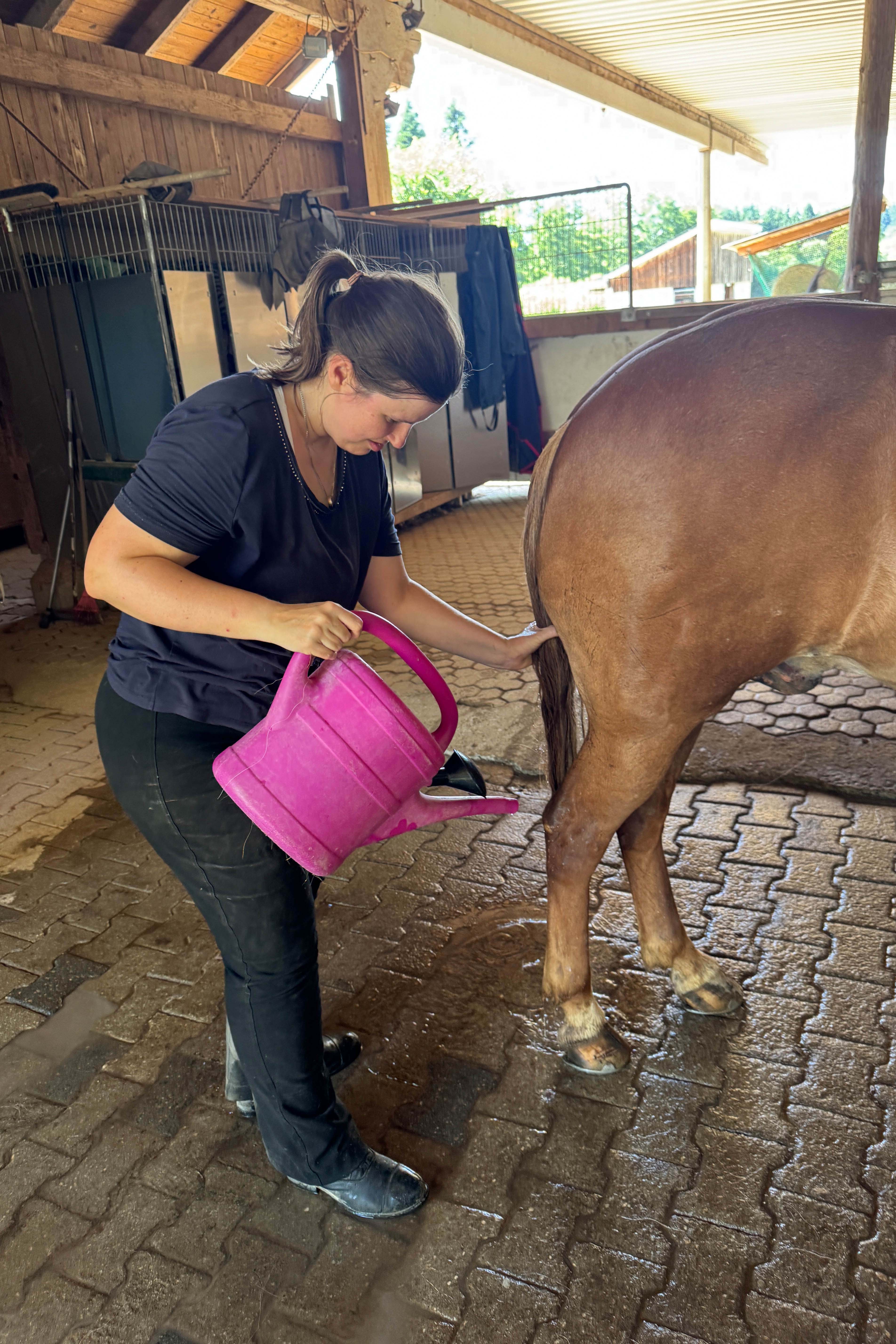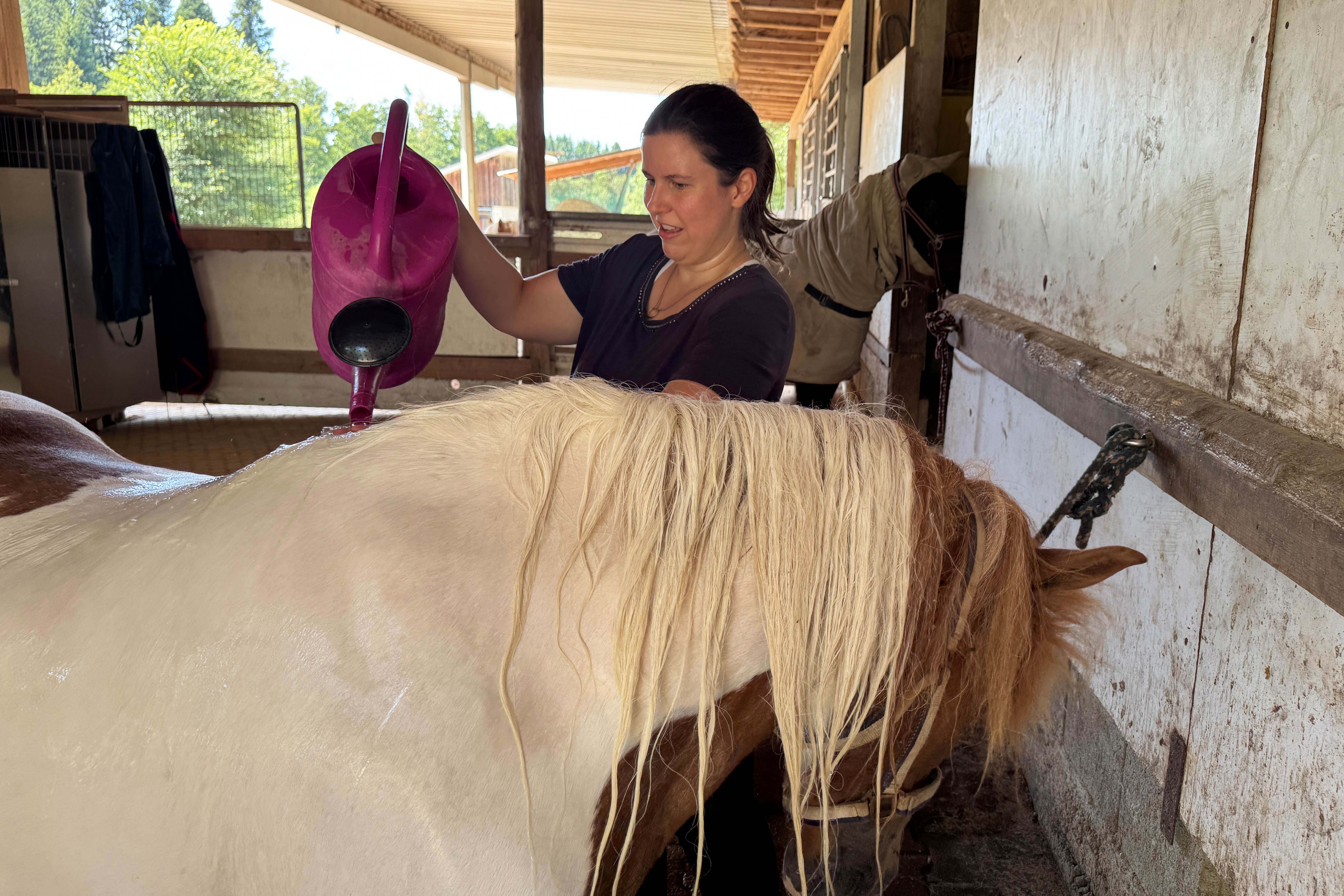 In der Mitte des Julis änderte sich das Wetter komplett. Musste man sich davor überlegen, bei der bestehenden Hitze etwas mit den Pferden zu machen, außer vielleicht eine Dusche aus der Gießkanne, so kam dann anschließend gut zwei Wochen lang immer wieder eine mehr oder weniger kräftige Dusche von oben. Zudem wurde es unangenehm kalt.