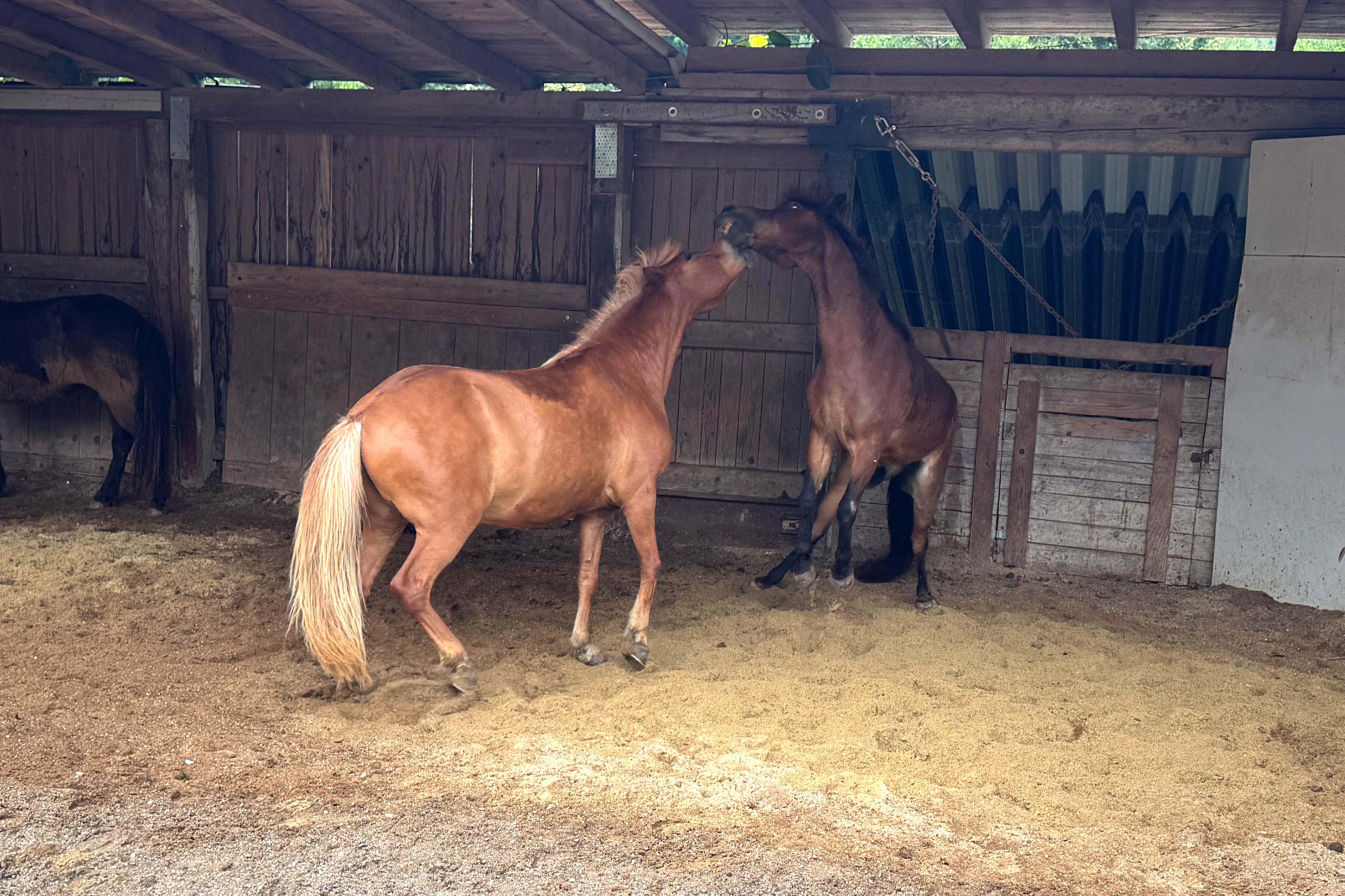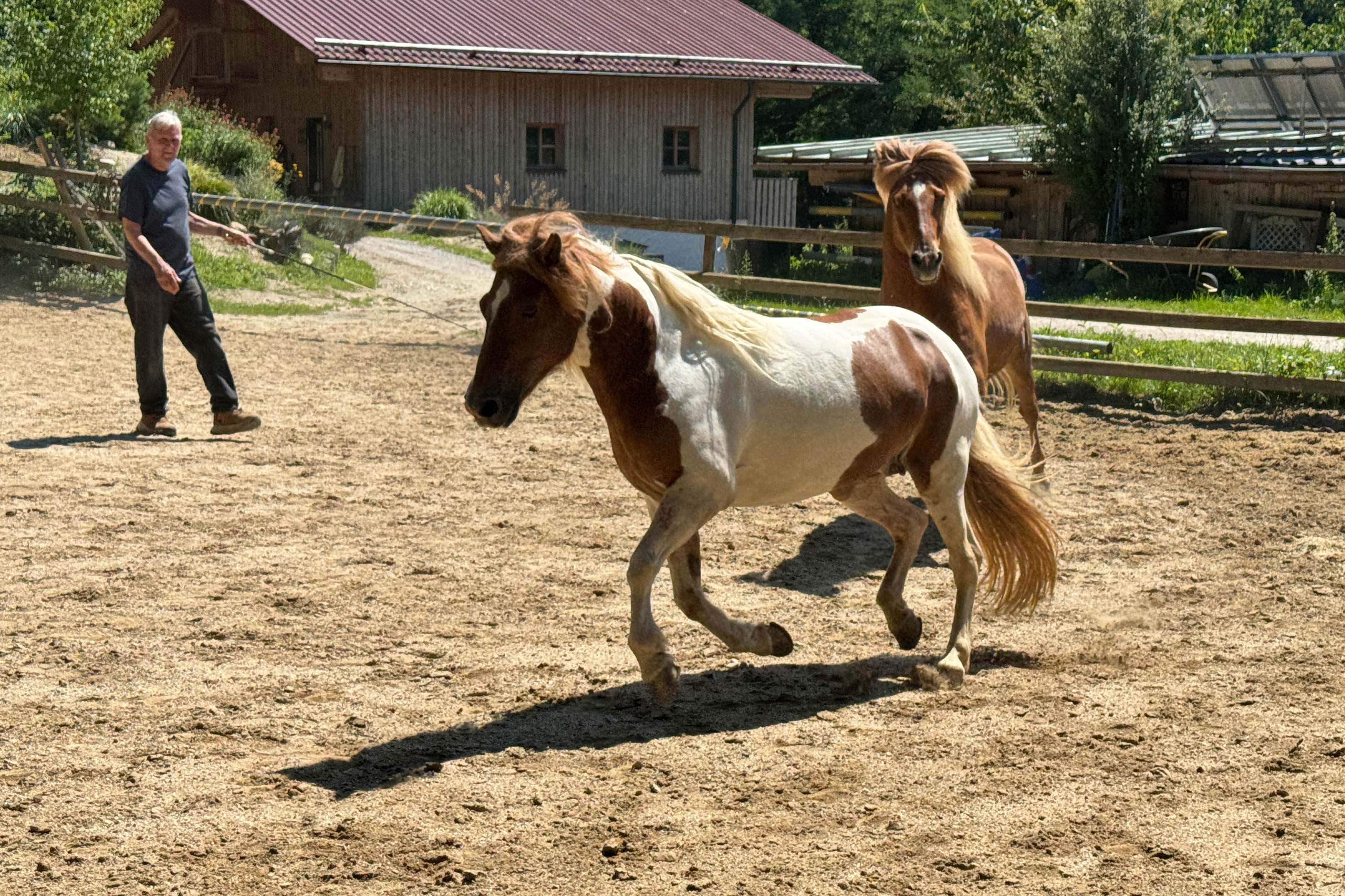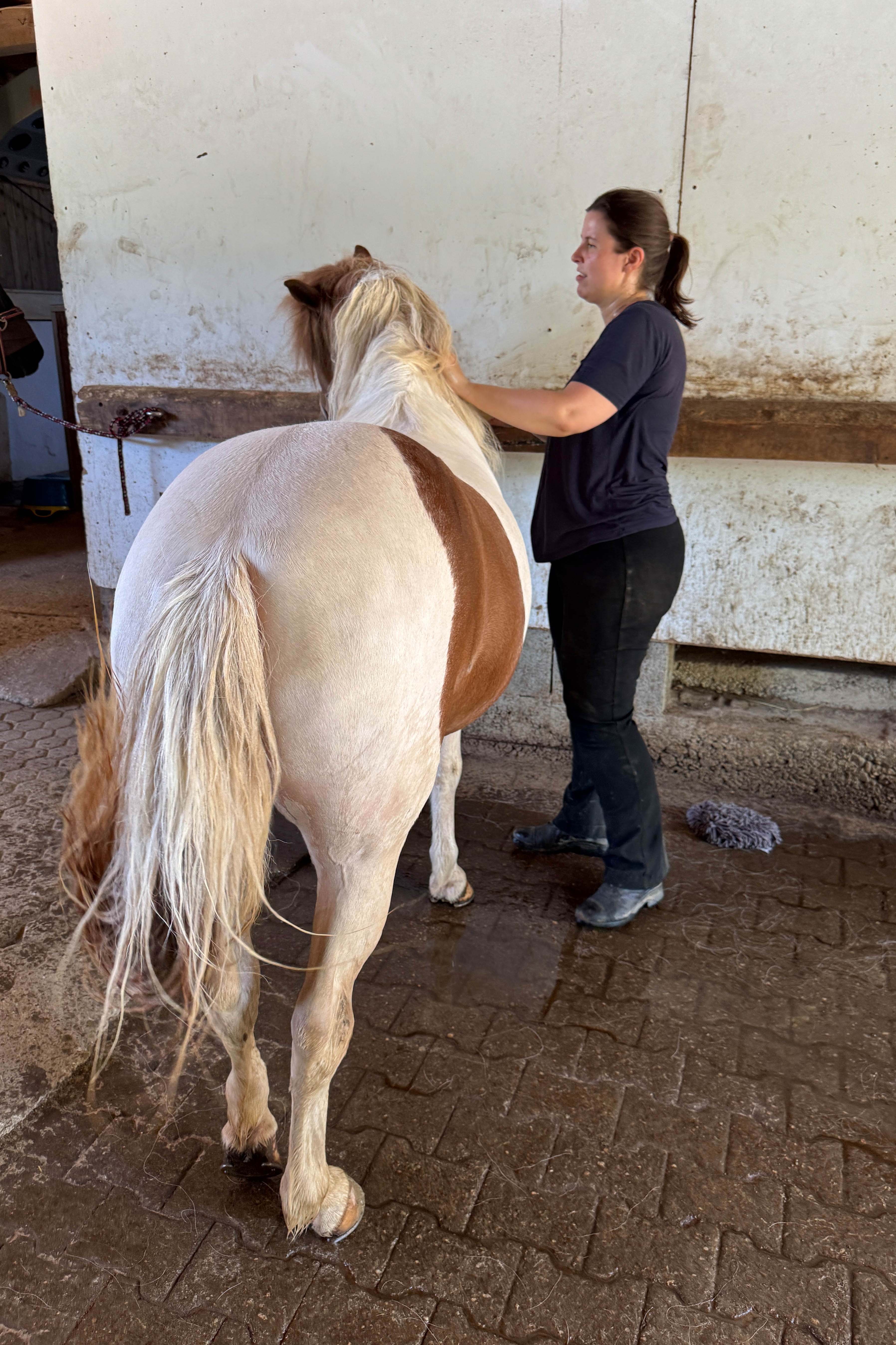 In der Mitte des Julis änderte sich das Wetter komplett. Musste man sich davor überlegen, bei der bestehenden Hitze etwas mit den Pferden zu machen, außer vielleicht eine Dusche aus der Gießkanne, so kam dann anschließend gut zwei Wochen lang immer wieder eine mehr oder weniger kräftige Dusche von oben. Zudem wurde es unangenehm kalt.
