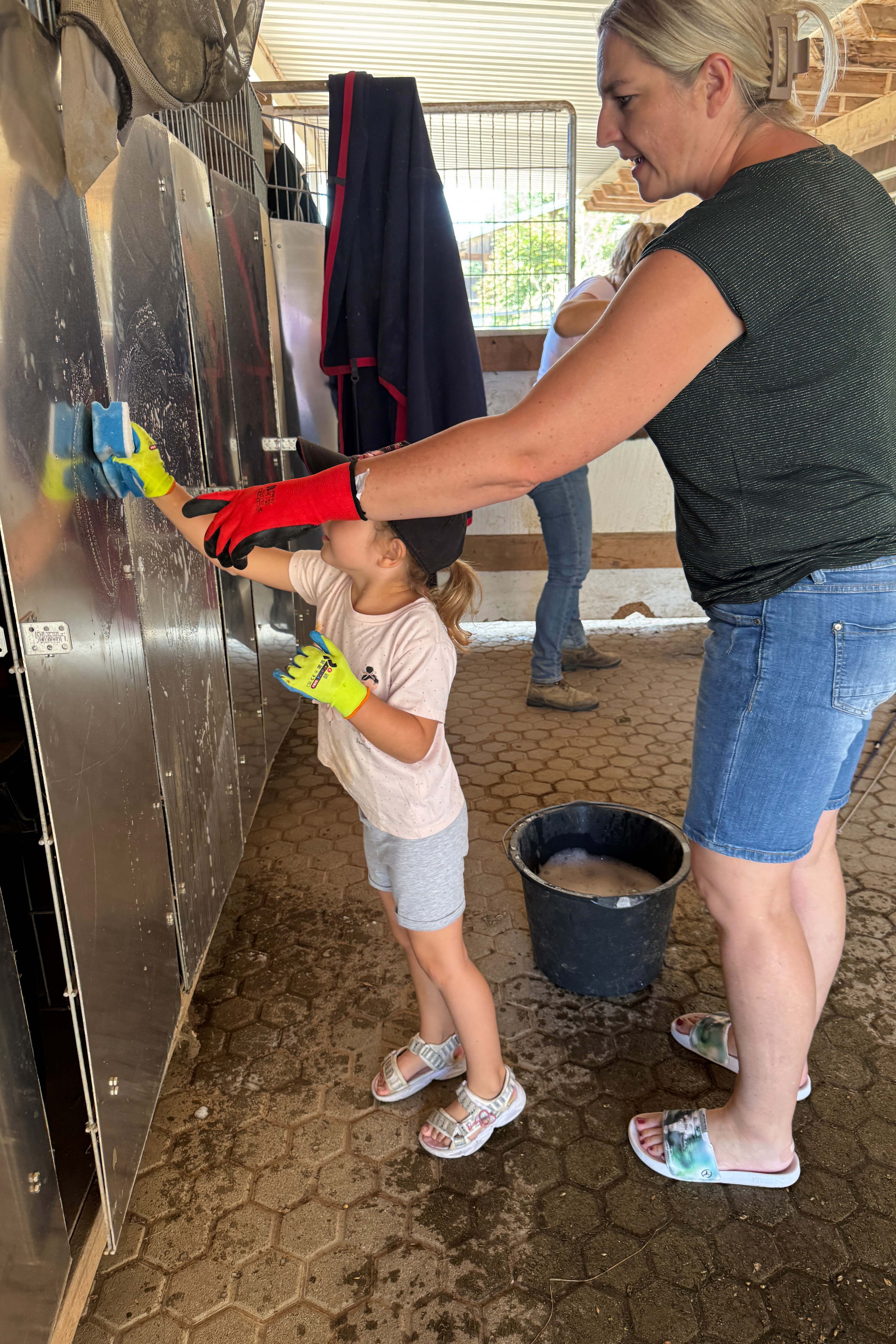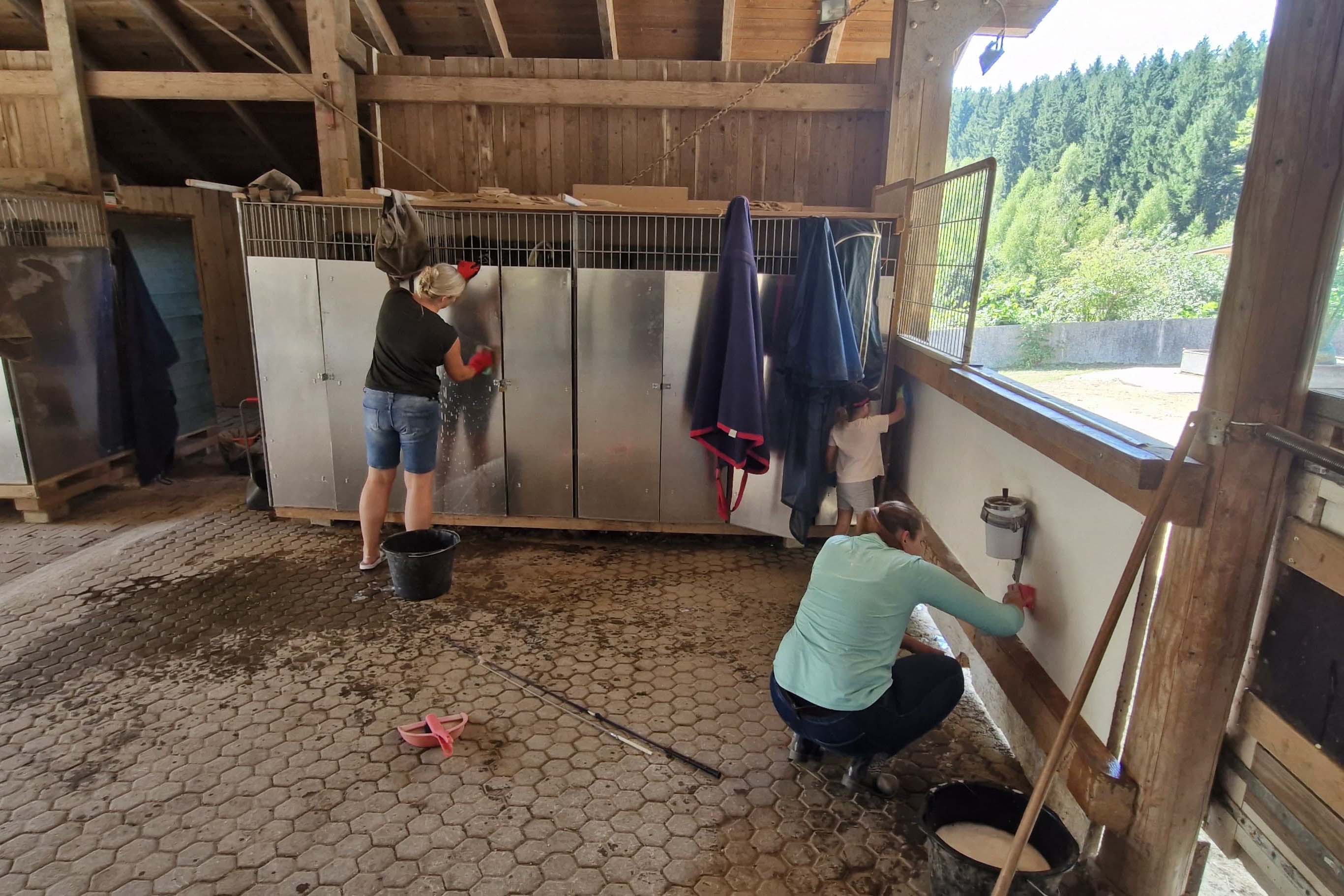 Ein noch sehr warmer Sommertag wurde genutzt einen Teil des Stallbereichs - rund um den Putzplatz der Pferde und die Spinde - auf "Hochglanz" zu bringen. Bei flotter Musik und vielen eifrigen Händen ging die Arbeit schnell voran, machte Spaß und das Ergebnis kann sich doch wirklich sehen lassen!! Zur Belohnung gabs Getränke im Reiterstüberl und selbst gebackene Croissants.