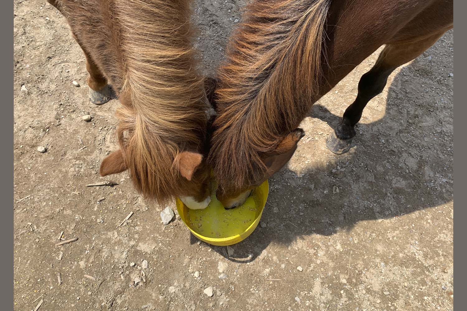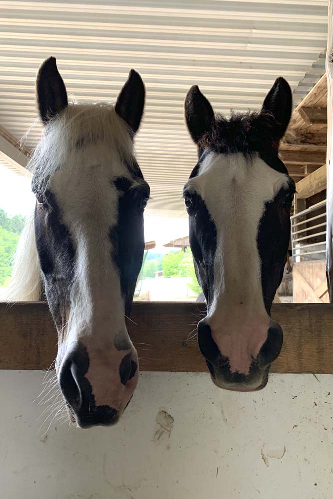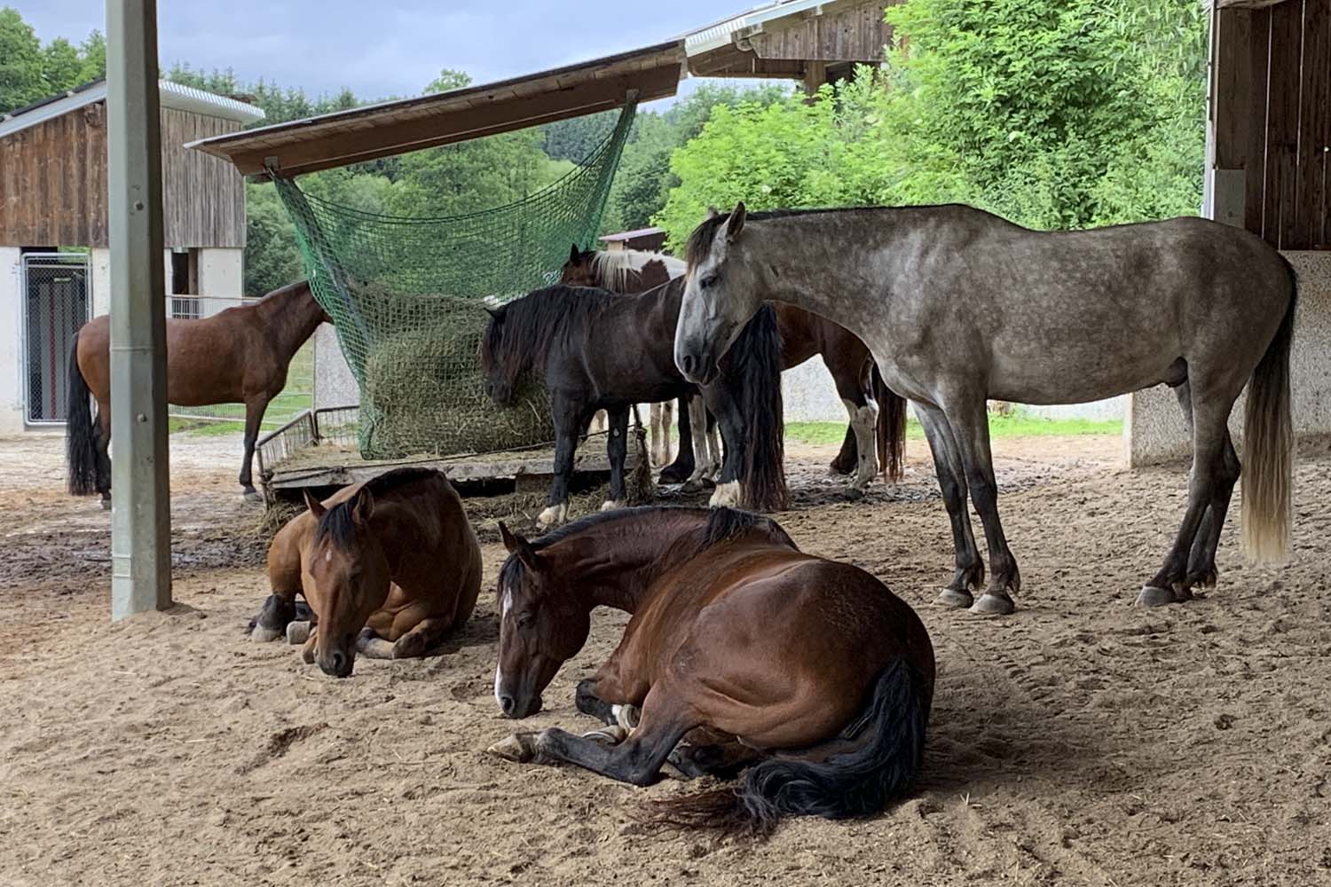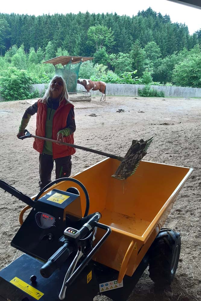Dumper Nr.3 kam an, ein sehr geschätzter "Mitarbeiter" beim Abmisten. Die Pferde genießen die Möglichkeit, rund um die Uhr auf die Koppel gehen zu können und auch die kühlen, großzügigen Liegehallen.