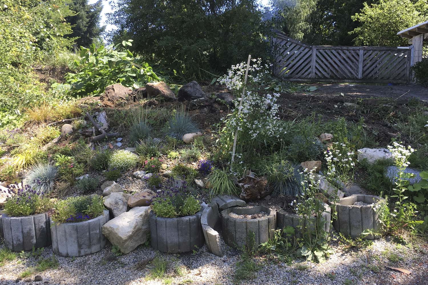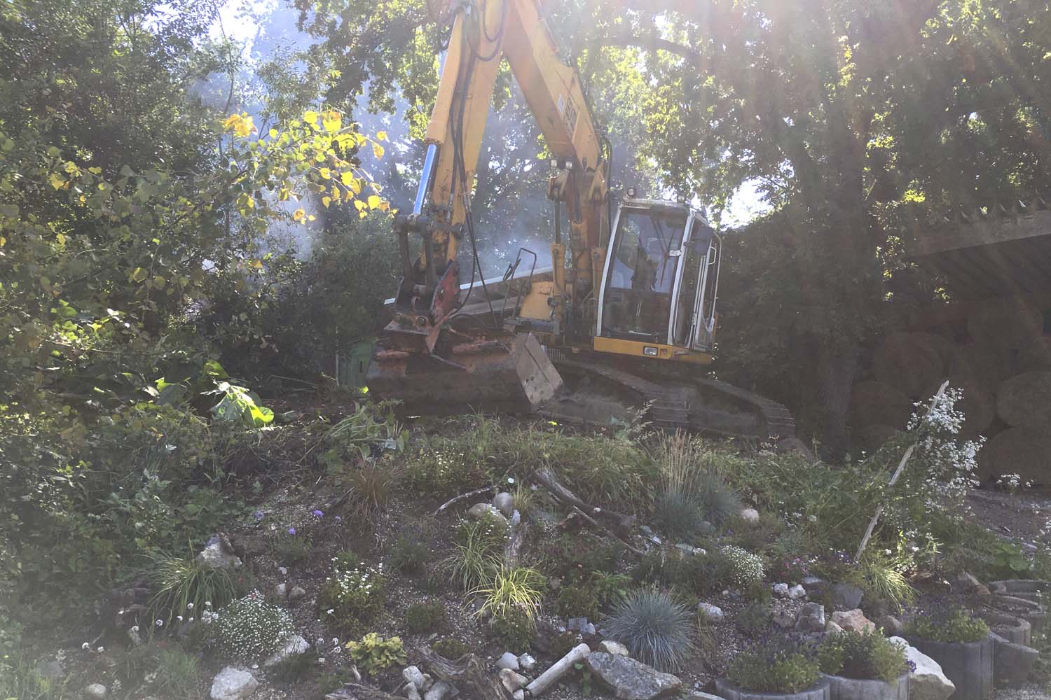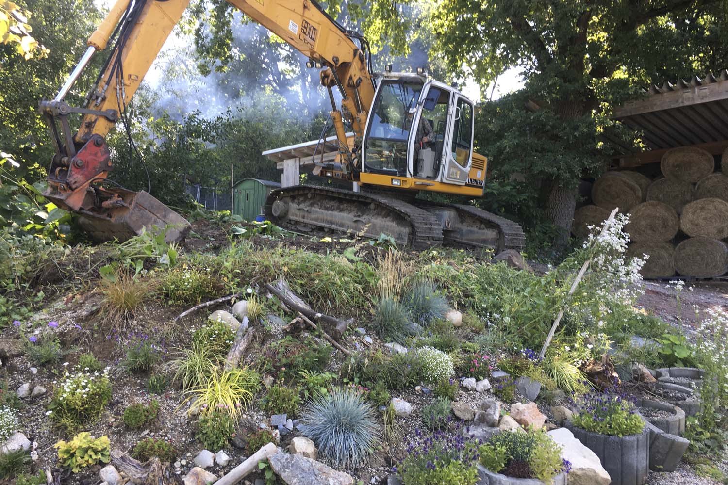 Das Brennholz für das Feuer war oberhalb des Steingartens beim Reitplatz gelagert gewesen. Nun wurde hier Platz für eine kleine Umgestaltung geschaffen, was für Stallbetreiber Hannes und seinen Bagger eine Kleinigkeit war. Ganz fertig ist der Bereich noch nicht, so sollen im Herbst im oberen Bereich Obstbäume gepflanzt werden.