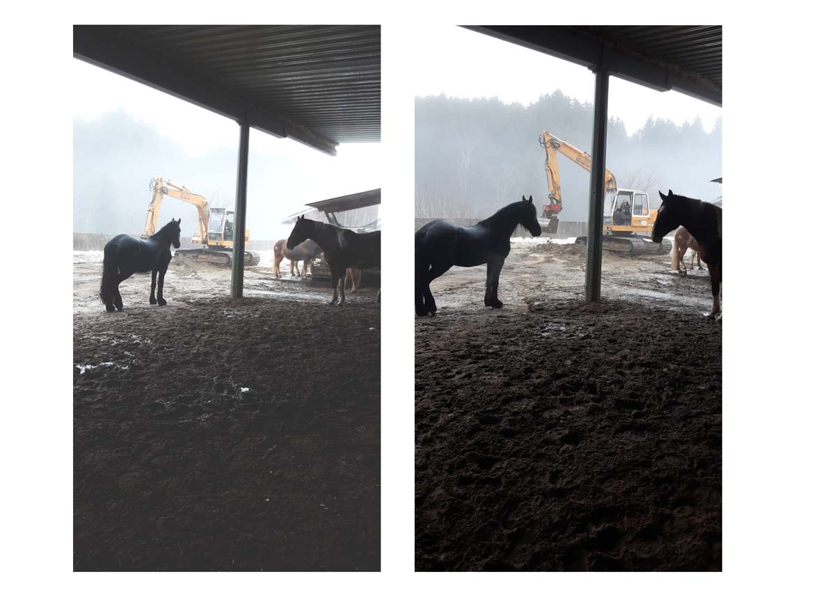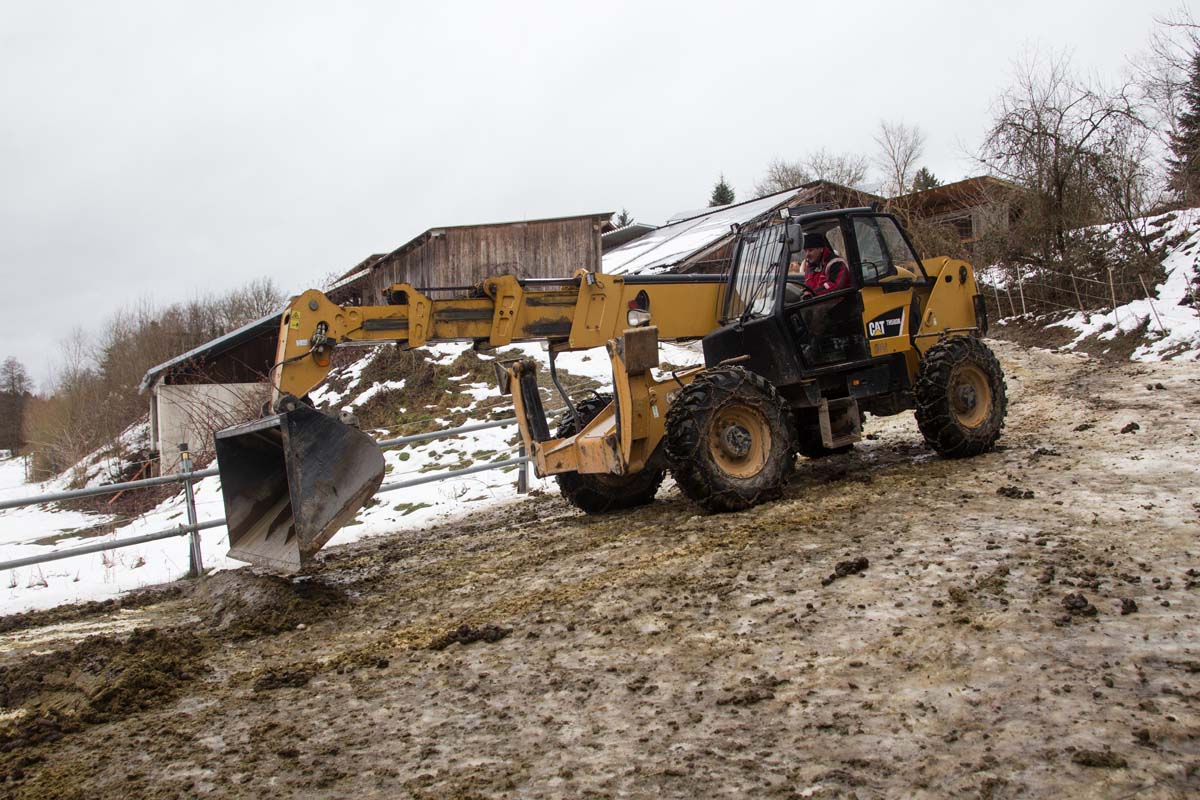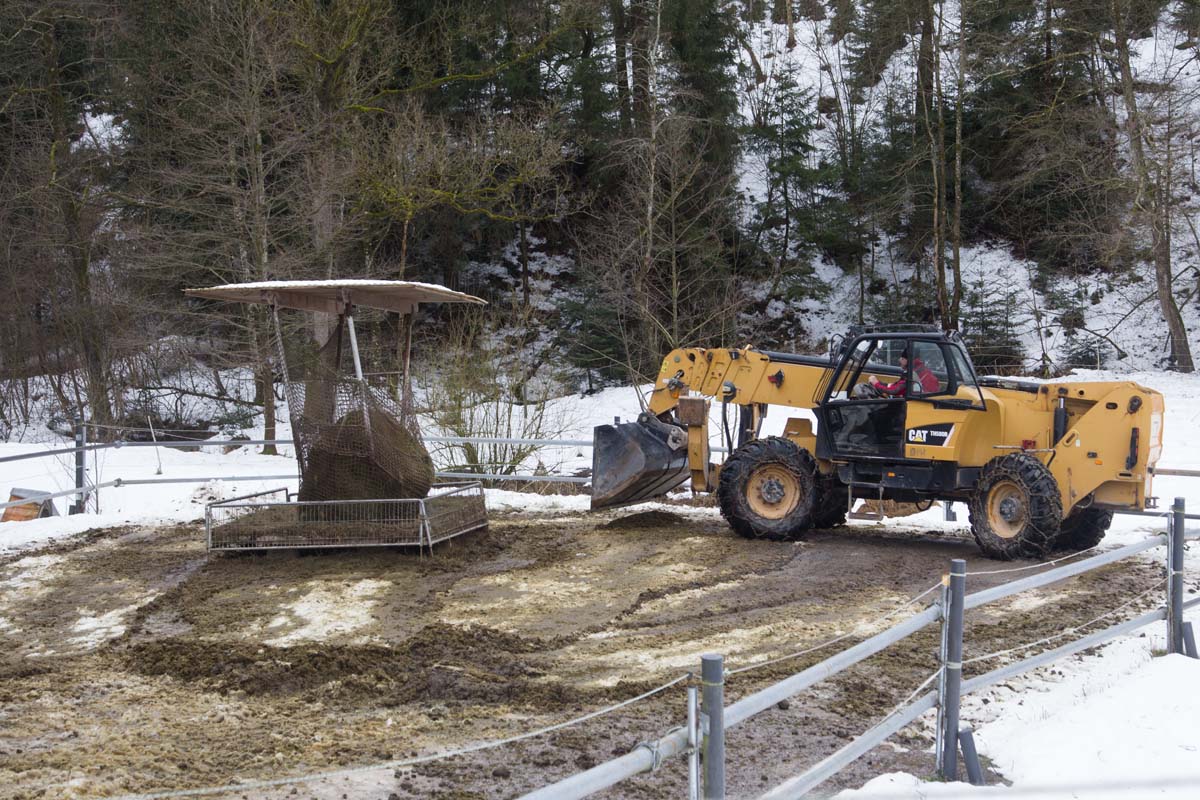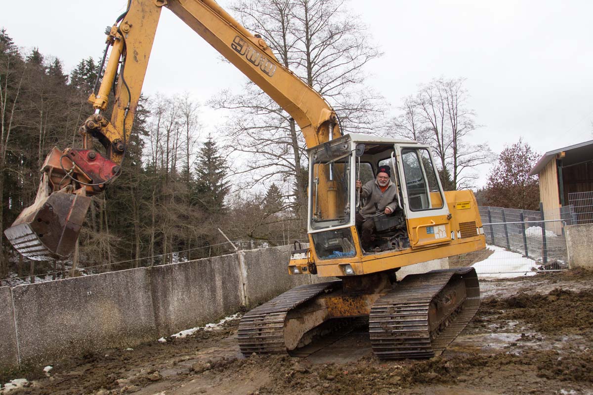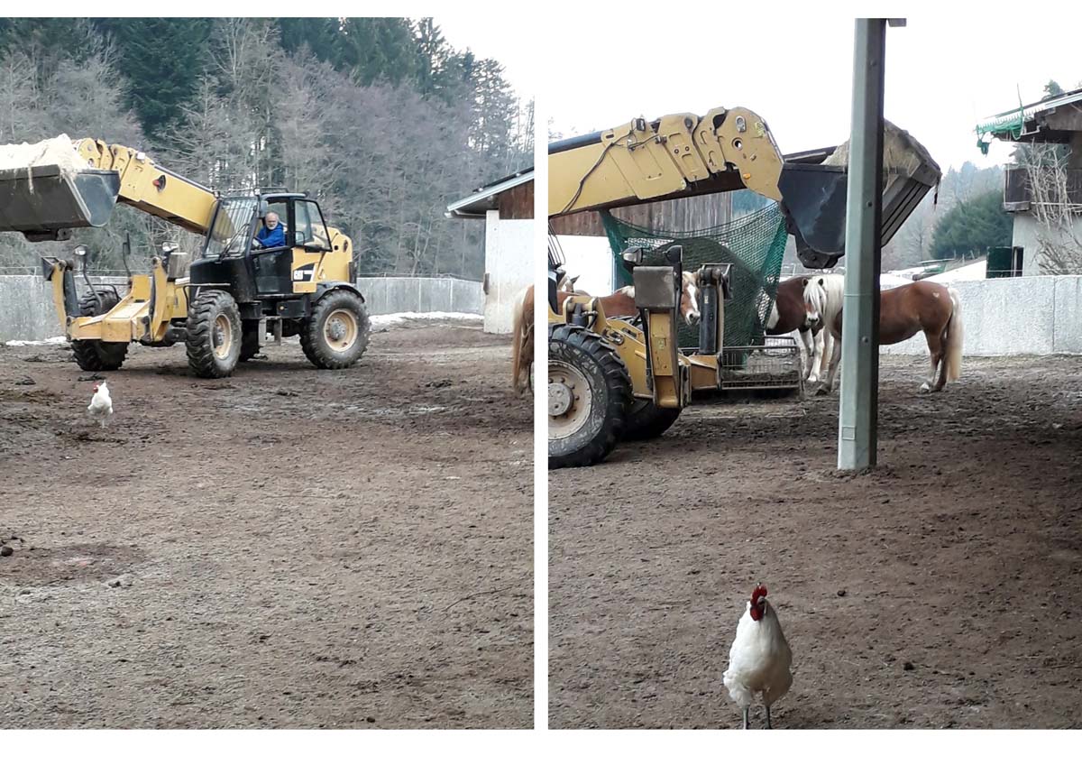 Aber das ist am Glockenhof überhaupt kein Problem, denn Stallbetreiber Hannes hat dafür die nötigen Fahrzeuge! Es kamen der Teleskoper und ein Bagger zum Einsatz.