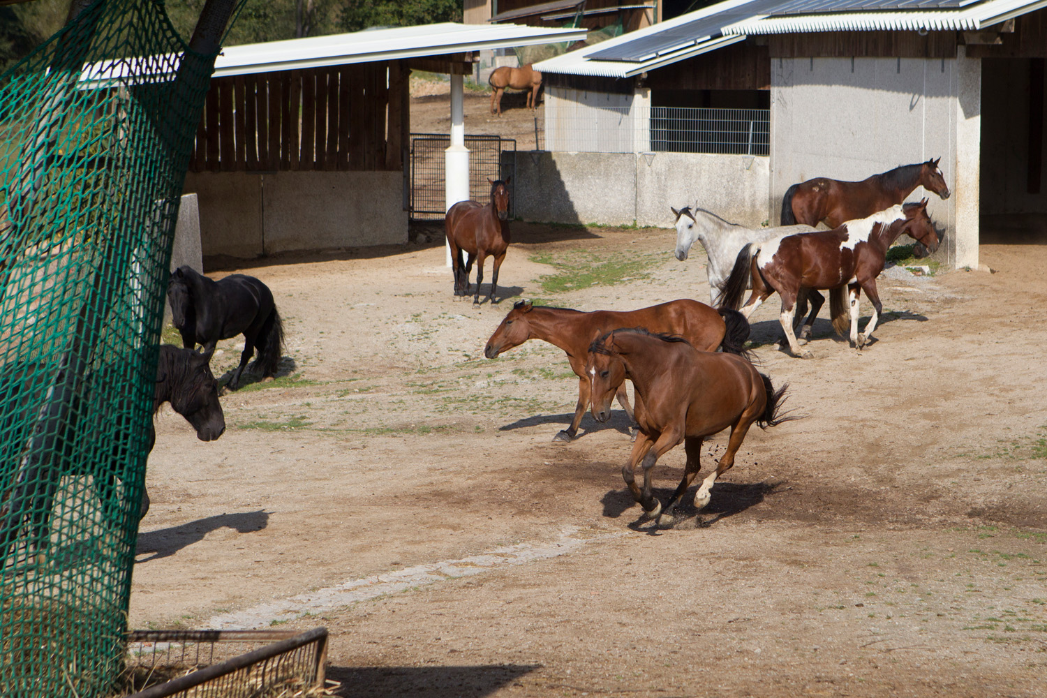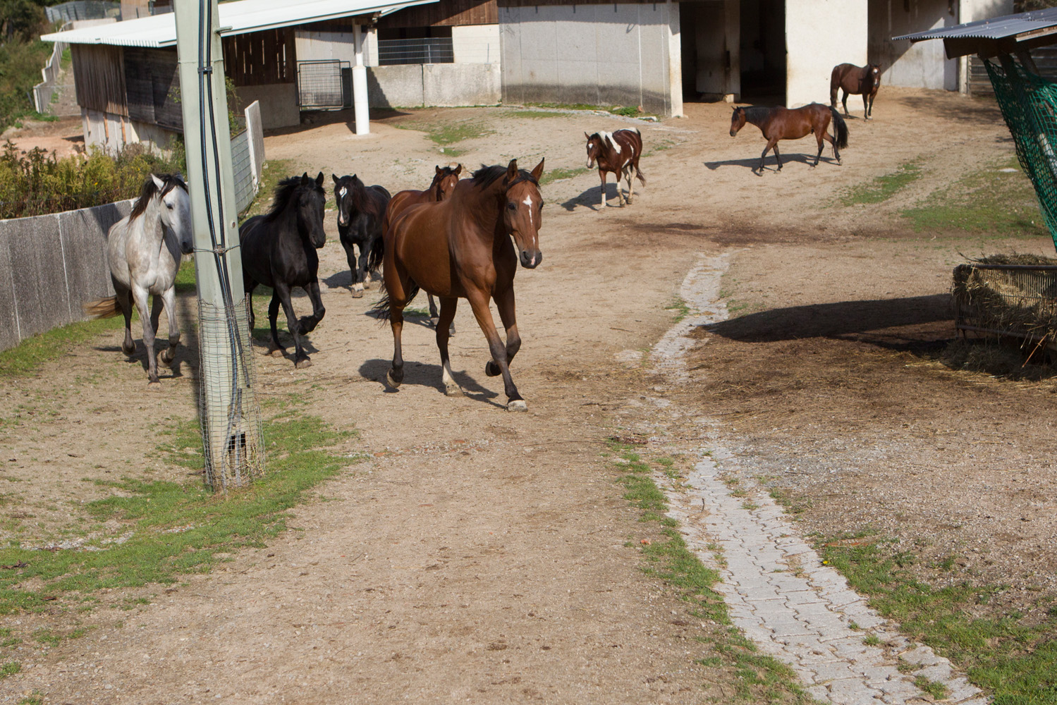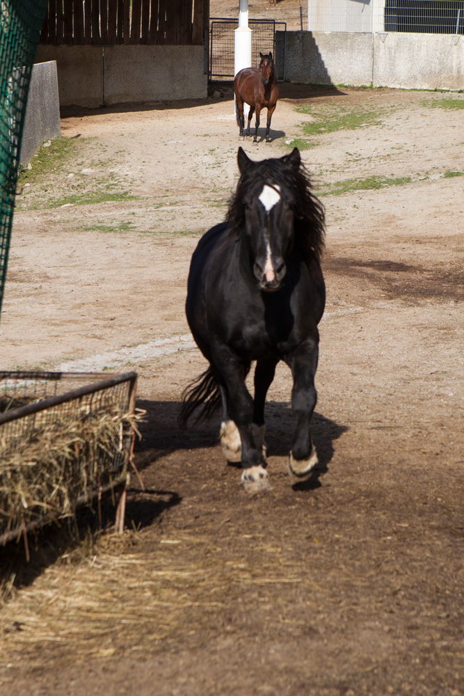 Selbstbewusst hielt er sich nicht lange im oberen Bereich des Paddocks auf, sondern steuerte gleich die unteren Bereiche an, in denen sich die meisten Pferde aufhielten. Einige von ihnen mussten den "Eindringling" verjagen und ein mehr oder weniger "wildes" Herauf- und Heruntergerenne begann. Aber alles nicht aggressiv. Als dann die Koppel geöffnet wurde, war alles sozusagen "im grünen Bereich". Navy erkundete weiter seine neue Heimat und der Rest der Herde war mit Grasen beschäftigt.