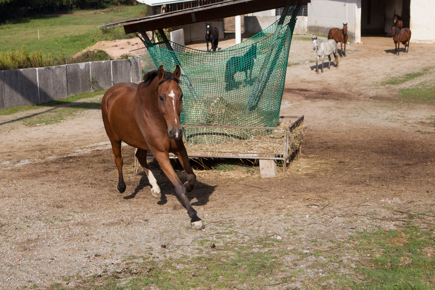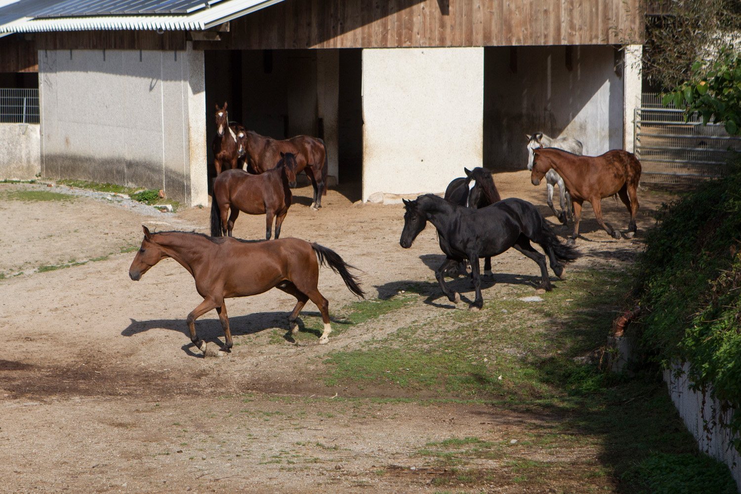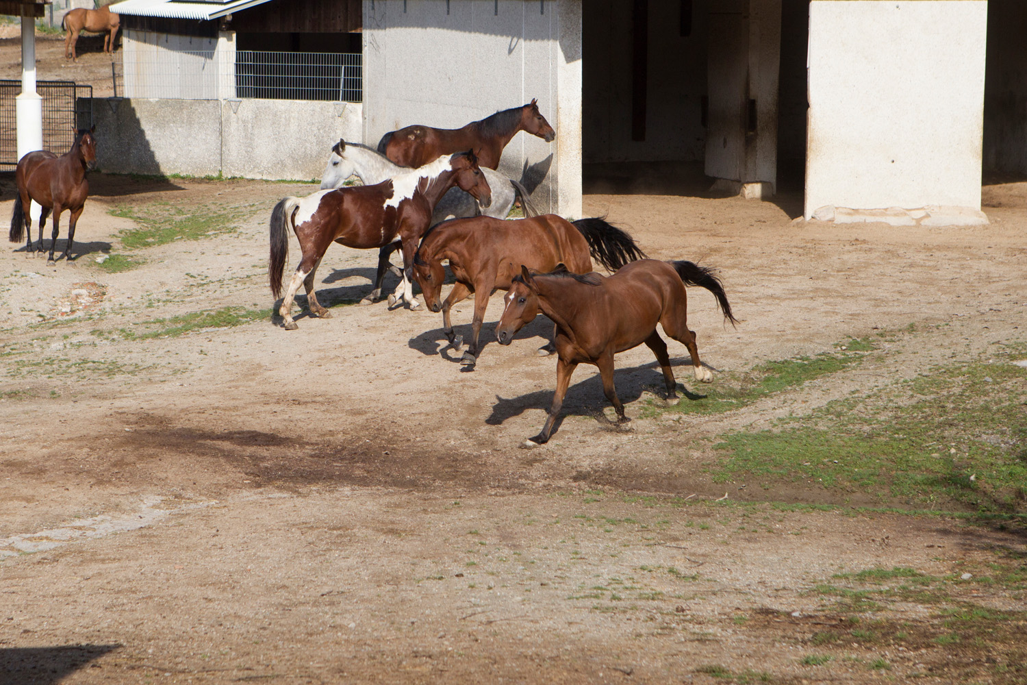Selbstbewusst hielt er sich nicht lange im oberen Bereich des Paddocks auf, sondern steuerte gleich die unteren Bereiche an, in denen sich die meisten Pferde aufhielten. Einige von ihnen mussten den "Eindringling" verjagen und ein mehr oder weniger "wildes" Herauf- und Heruntergerenne begann. Aber alles nicht aggressiv. Als dann die Koppel geöffnet wurde, war alles sozusagen "im grünen Bereich". Navy erkundete weiter seine neue Heimat und der Rest der Herde war mit Grasen beschäftigt.