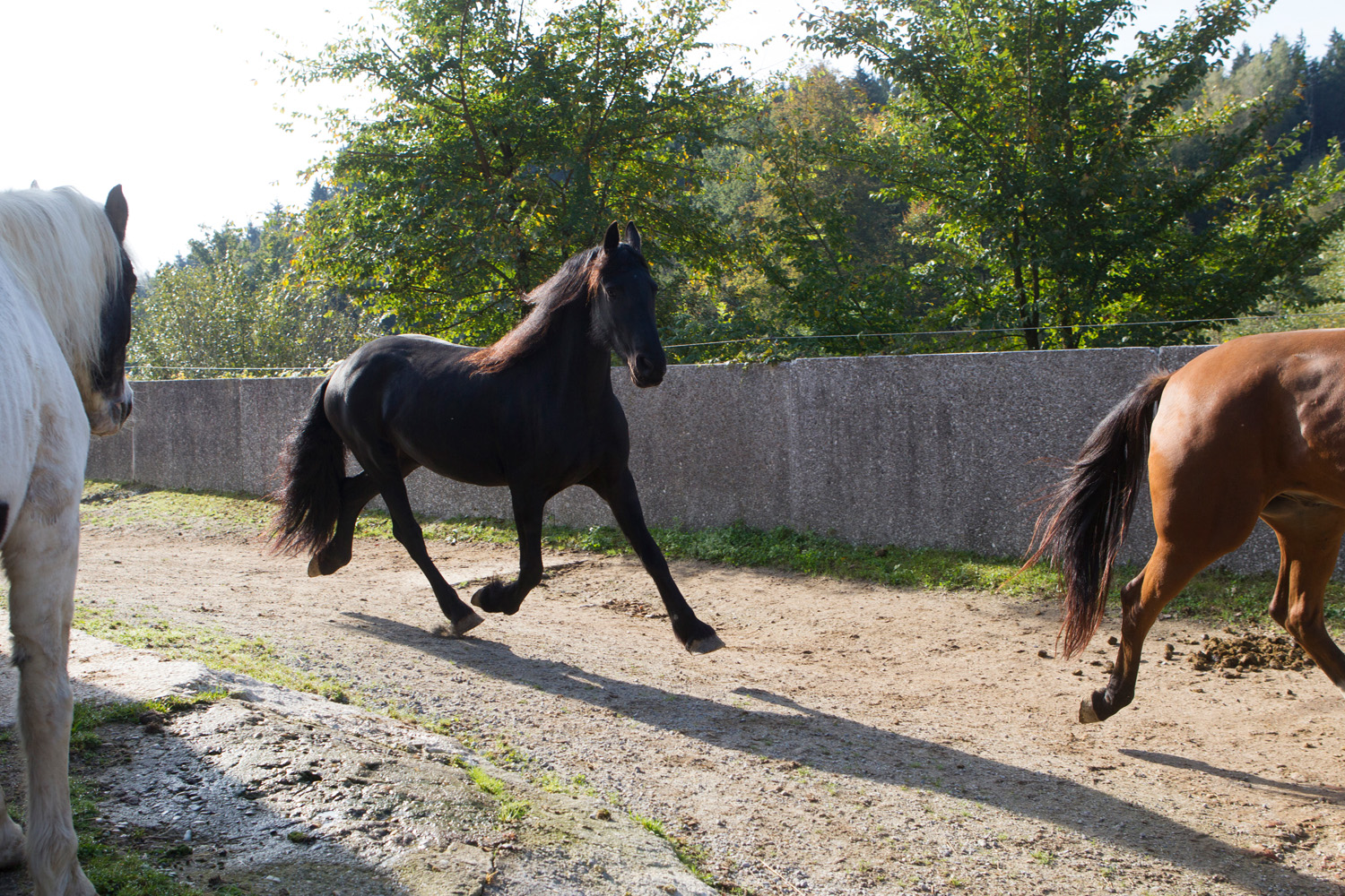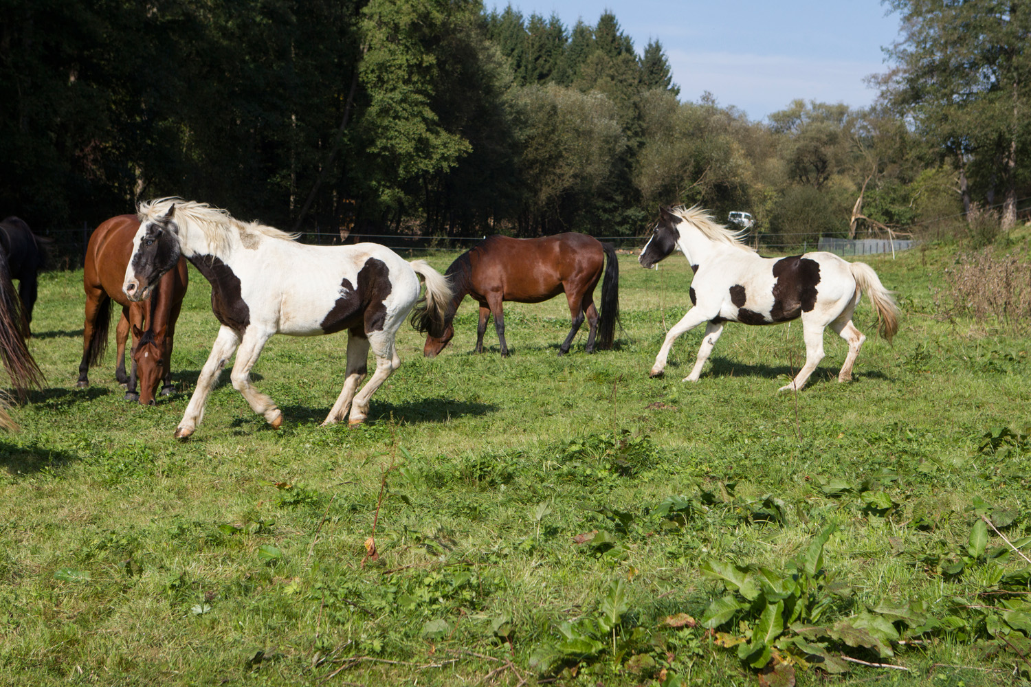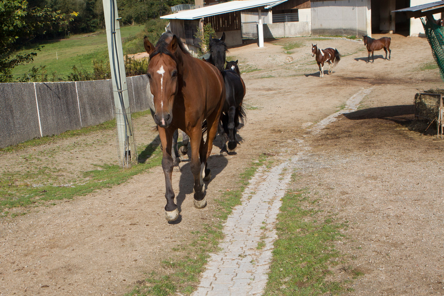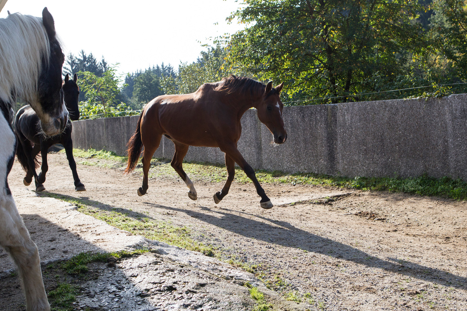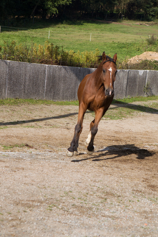 Bei herrlichem Herbstwetter durfte Navy, ein Zweibrücker Warmblut, am 2. Oktober seinen neuen Stall und seine neue Herde kennenlernen. Er lebt nun in der "großen Herde", der "Heugruppe".