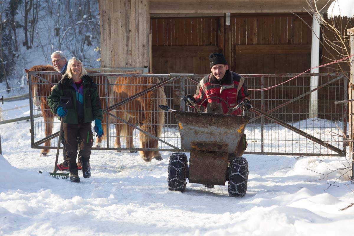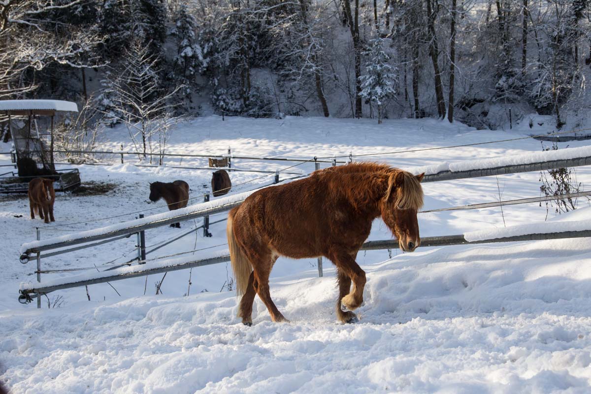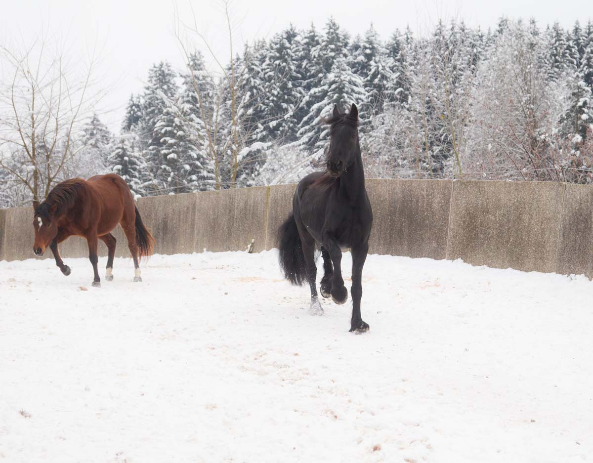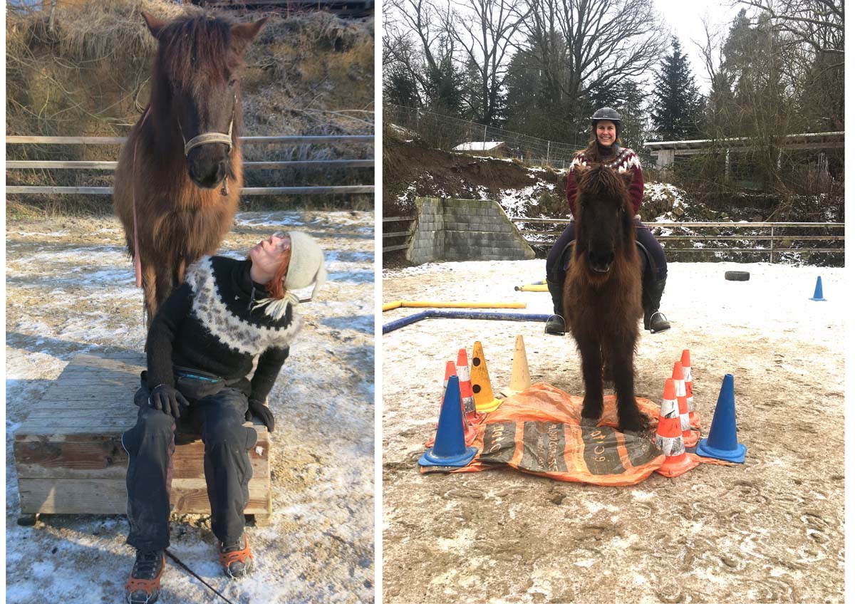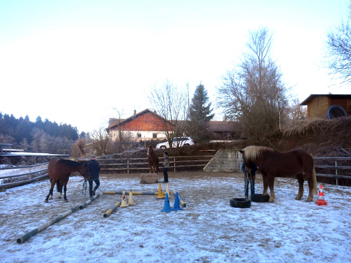 Der Reitplatz konnte gut genutzt werden. Als noch weniger Schnee lag mit einem Geschicklichkeitsparcours, ansonsten zum Freilaufen oder auch zum Reiten. Bei den Isländern waren pinkfarbene Grips angesagt, sehr chic!