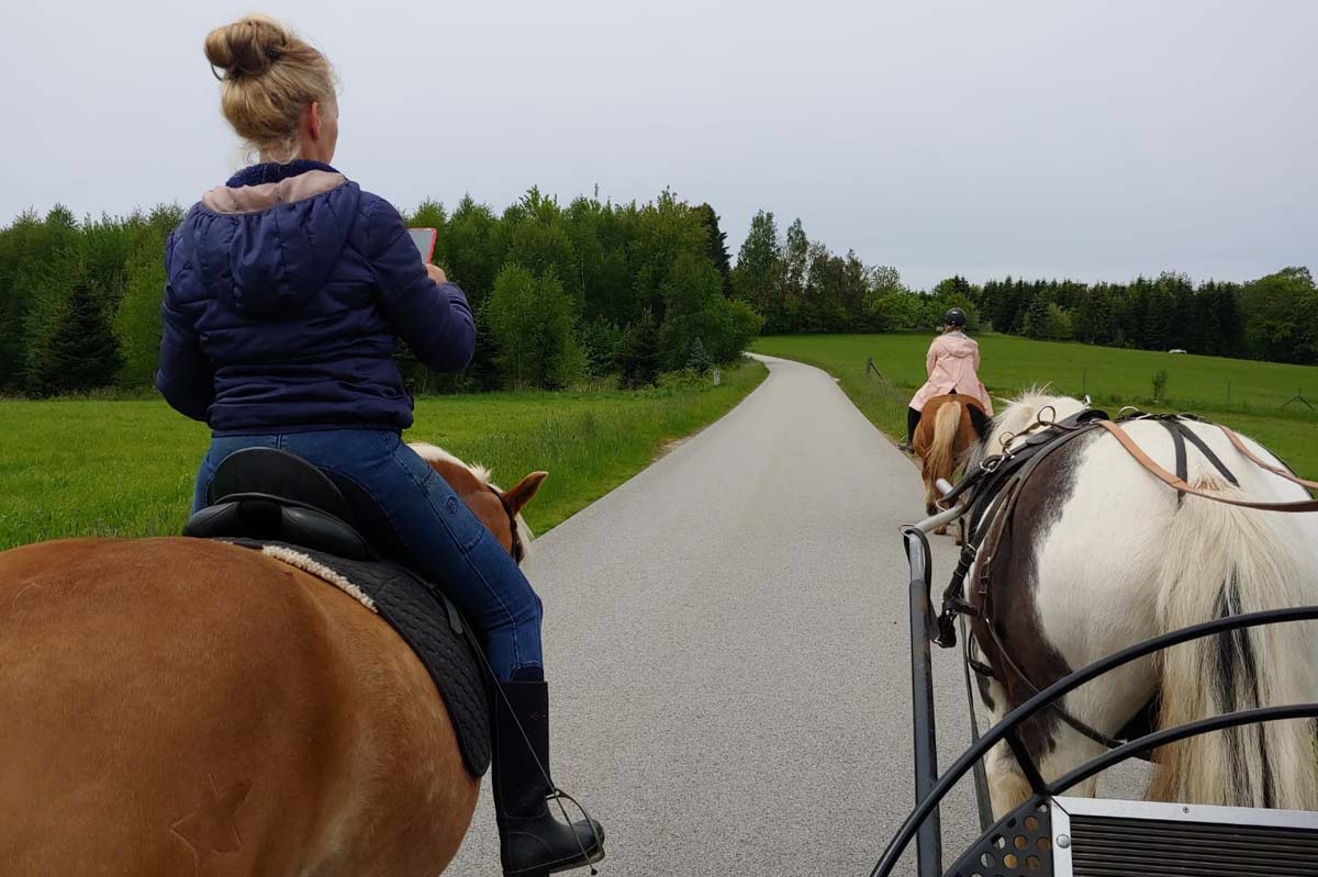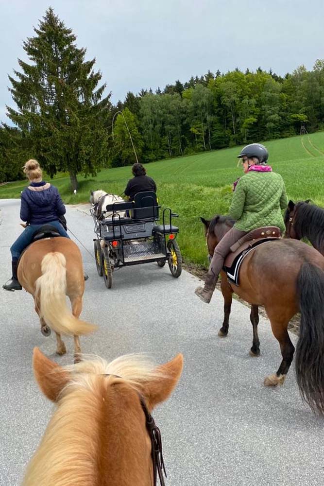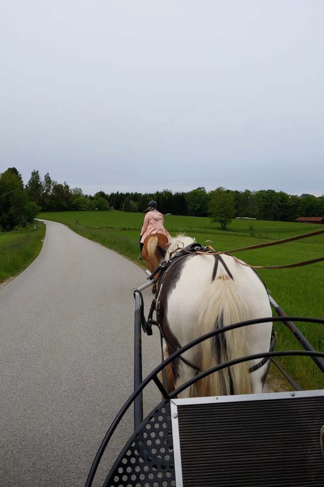 Der "Wonnenmonat" Mai zeigte sich dieses Jahr ganz und gar nicht "wonnig", sehr nass und kalt war er. Der fast regenlose Pfingstmontag wurde von Alex und ihrem Blue genutzt mal wieder einzuspannen und Kutsche zu fahren. Mit von der Partie waren andere "Glockenhofer", entweder hoch zu Ross oder zu Fuss.