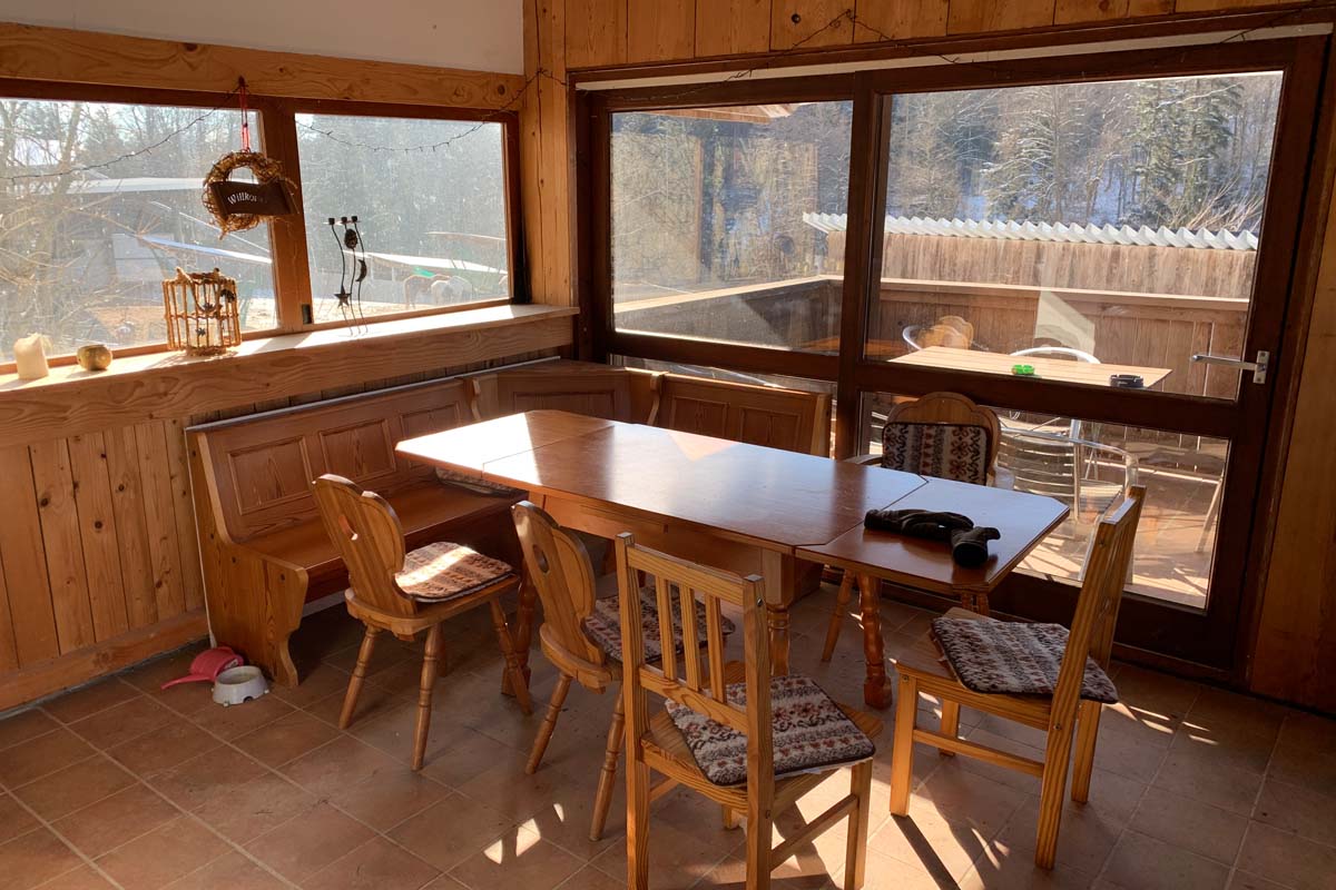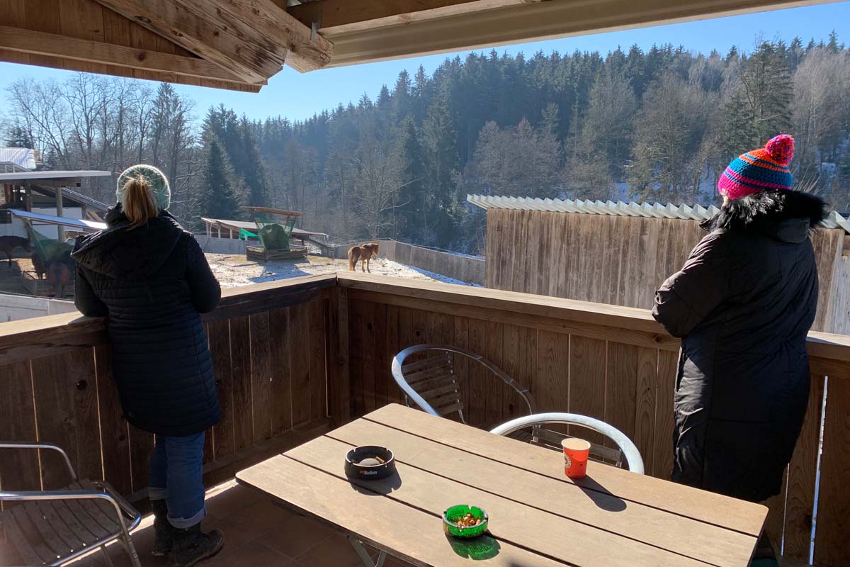 Bei einem kühlen oder warmen/heißen Getränk aus dem Automaten lässt sich der Ausblick aus dem Stüberl und besonders schön von der Terrasse auf die Stallanlage und die Pferde genießen. Für die Einsteller befindet sich hier auch eine Toilette.