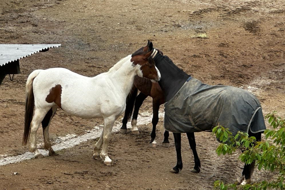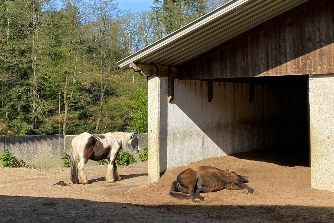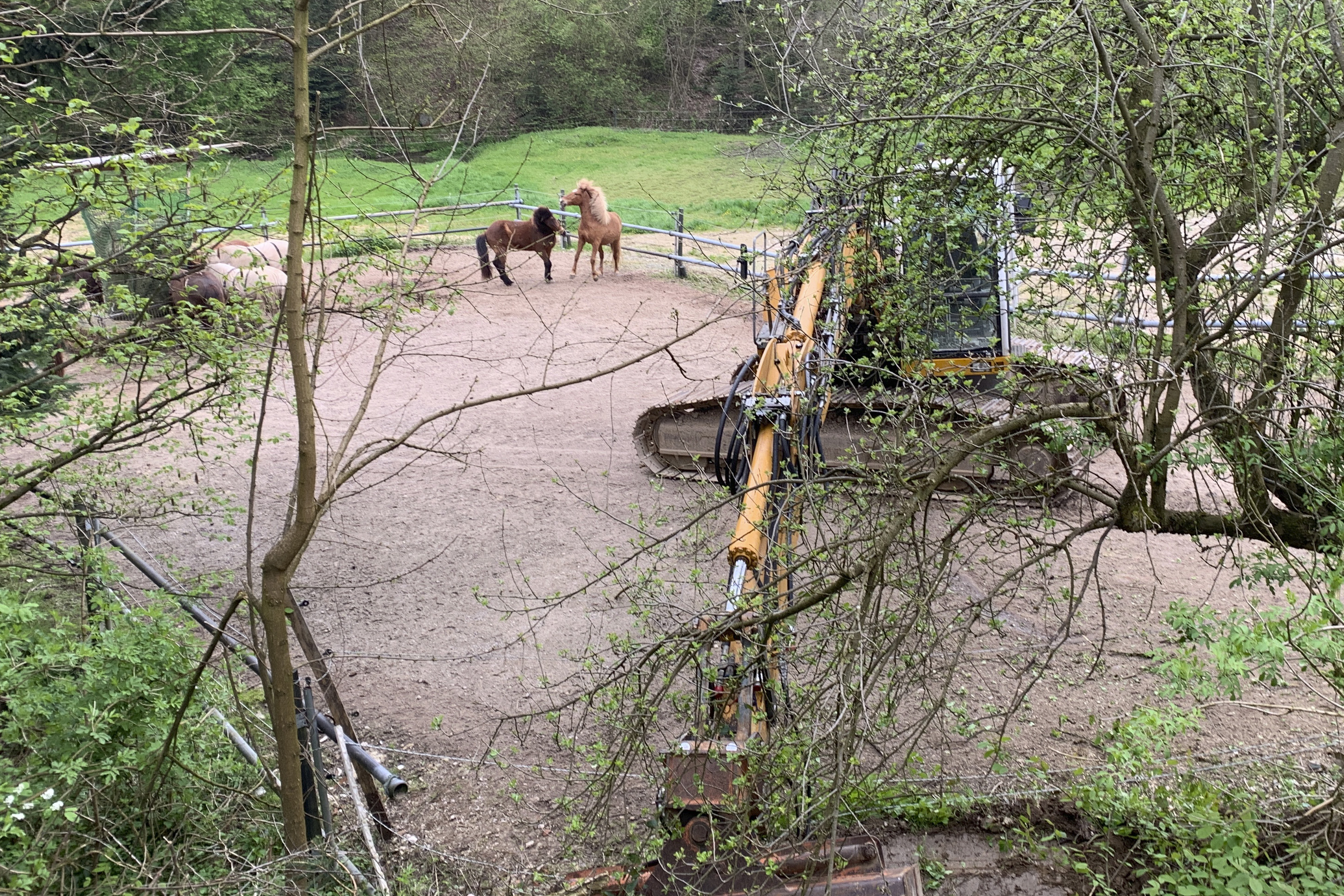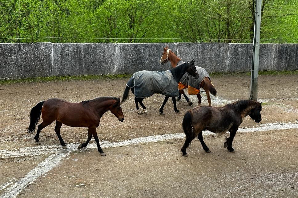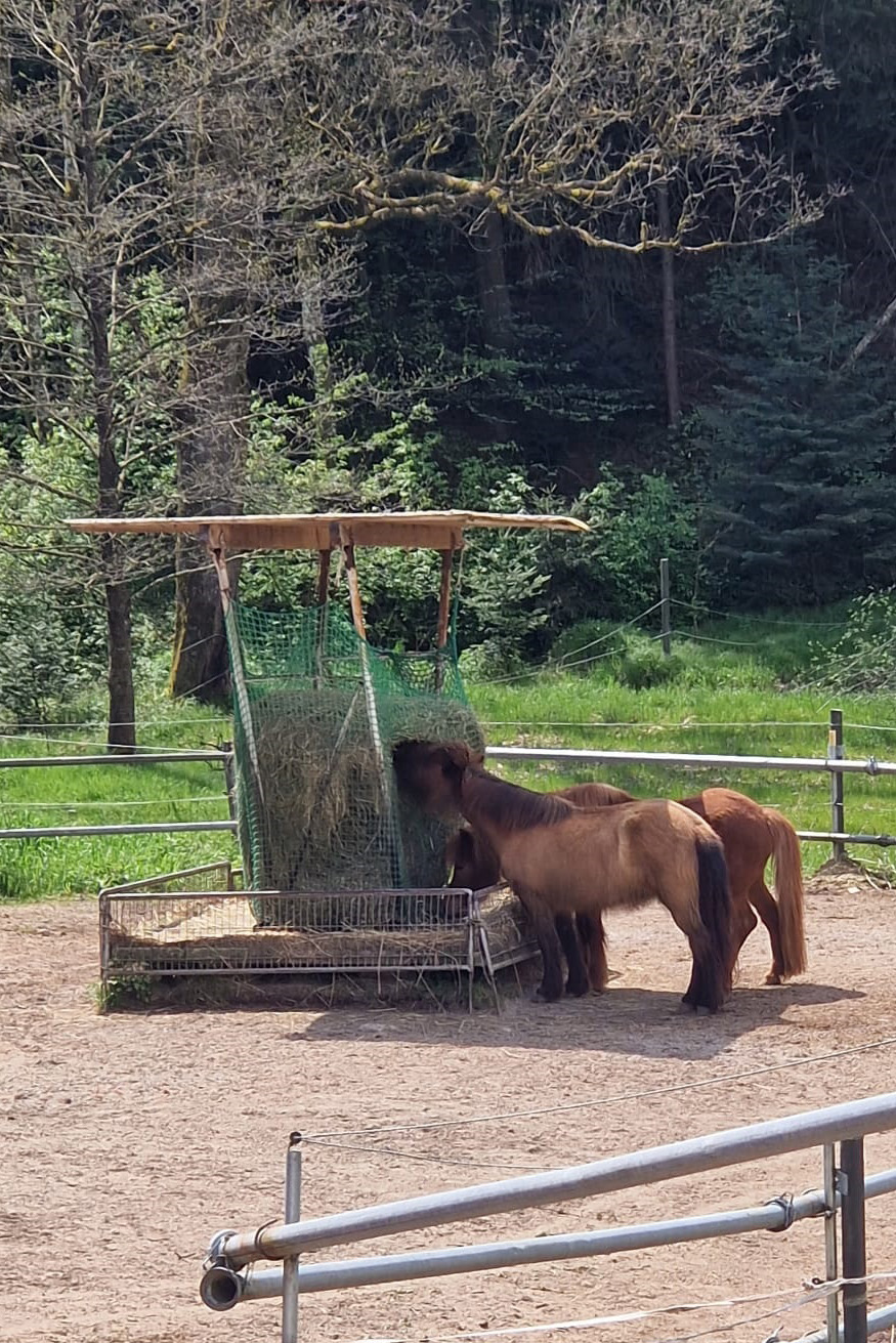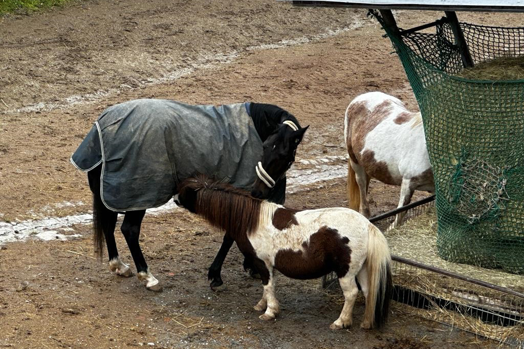 ... und noch einmal gab es Neuzugänge sowohl für die Heuherde, als auch für die Allergikerherde. Willkommen Plato, Lion, Cookie(Kuki), Paul und Talia. Letztere kam erst frisch von der Klinik und kann sich erst einmal im eigenen Paddock eingewöhnen, die anderen sind nach kurzer Zeit im Paddock in die Herde eingephast worden. Bei der Isländerherde wurde der Zaun erneuert, kein Grund zur Aufregung über das "große gelbe Pferd"! Talia geniesst gleich an ihren ersten Tagen hier das Solarium, mittlerweile hatte nämlich Dauerregen eingesetzt.