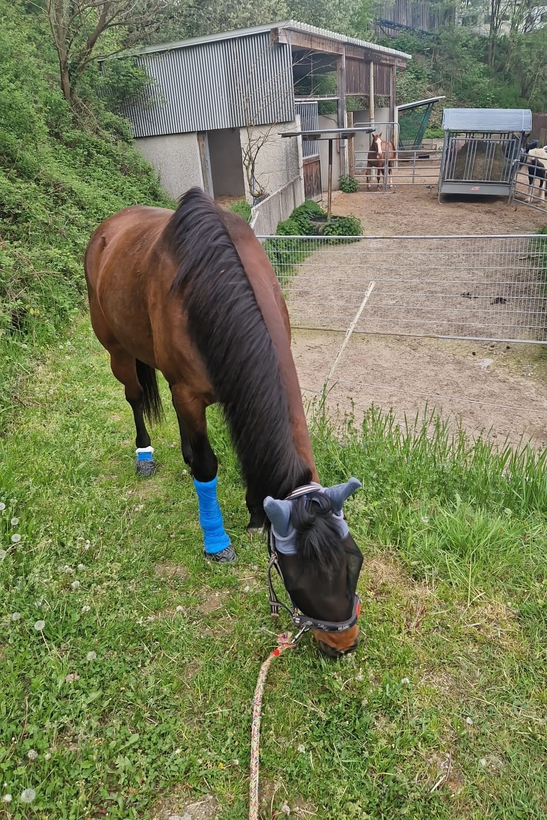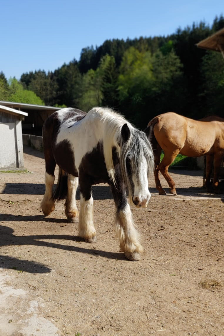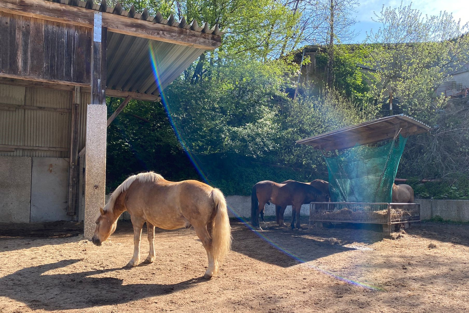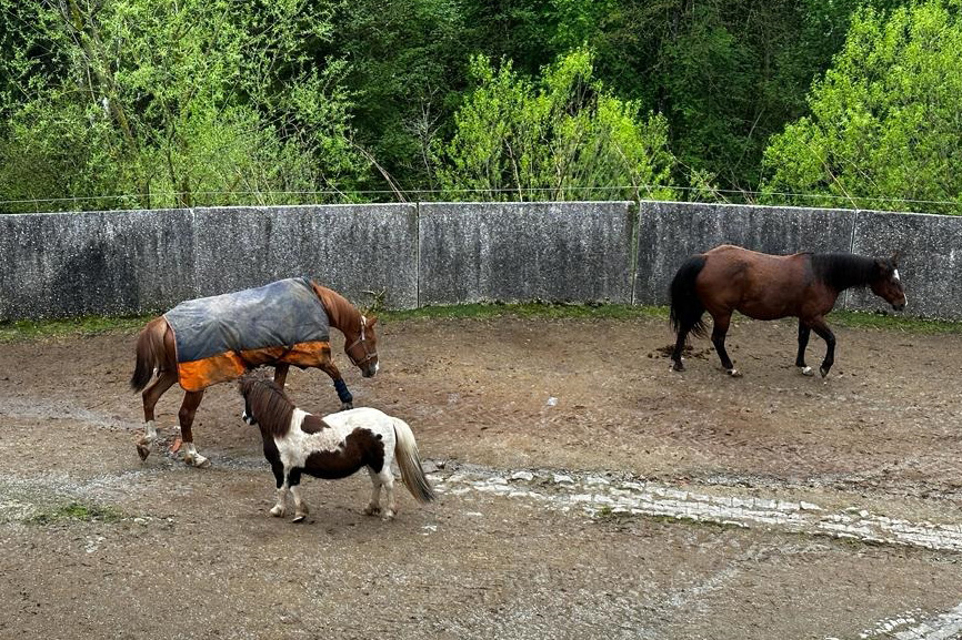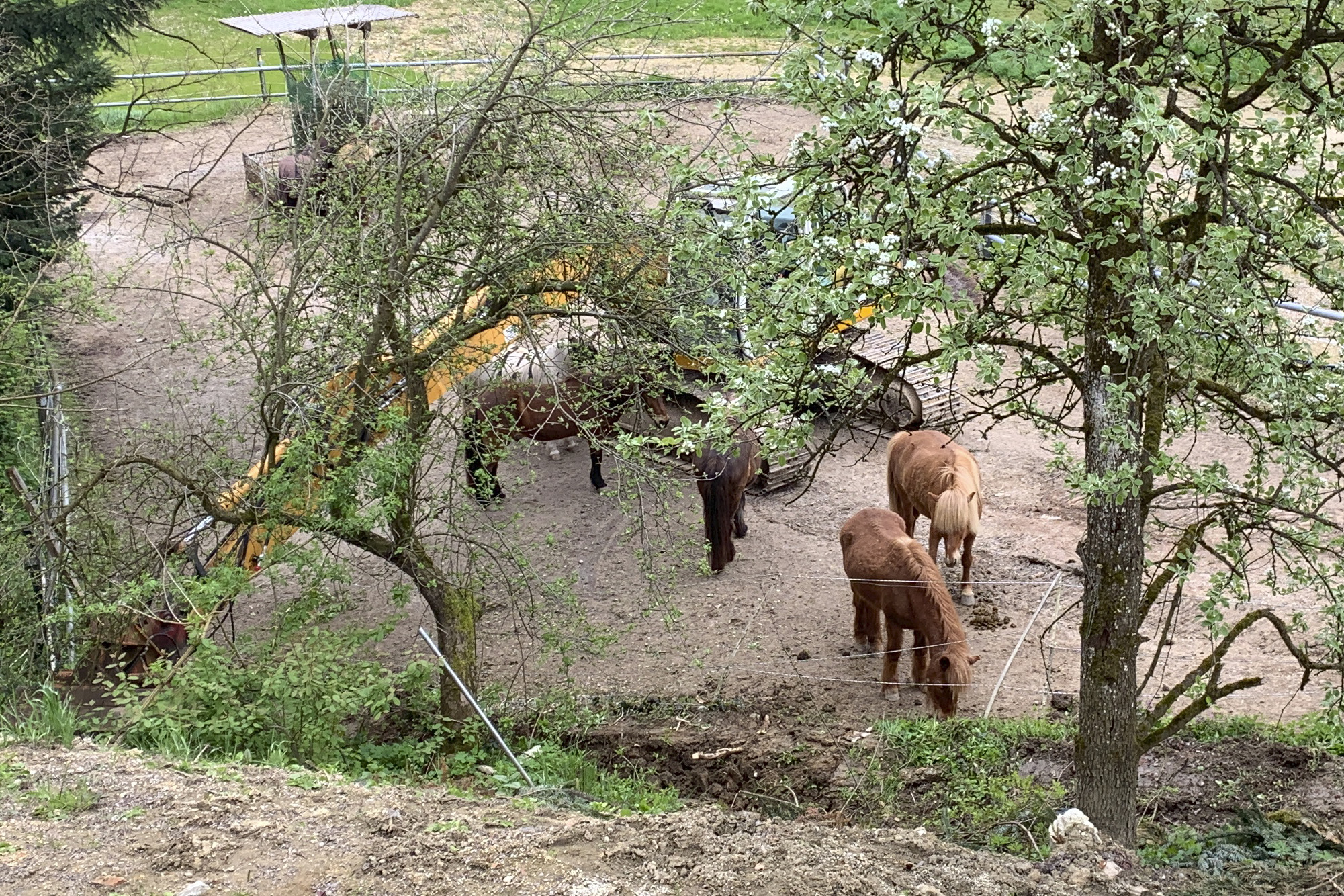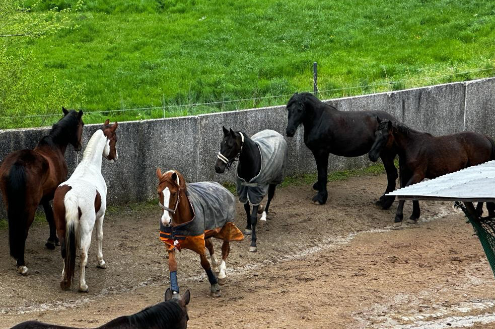 ... und noch einmal gab es Neuzugänge sowohl für die Heuherde, als auch für die Allergikerherde. Willkommen Plato, Lion, Cookie(Kuki), Paul und Talia. Letztere kam erst frisch von der Klinik und kann sich erst einmal im eigenen Paddock eingewöhnen, die anderen sind nach kurzer Zeit im Paddock in die Herde eingephast worden. Bei der Isländerherde wurde der Zaun erneuert, kein Grund zur Aufregung über das "große gelbe Pferd"! Talia geniesst gleich an ihren ersten Tagen hier das Solarium, mittlerweile hatte nämlich Dauerregen eingesetzt.
