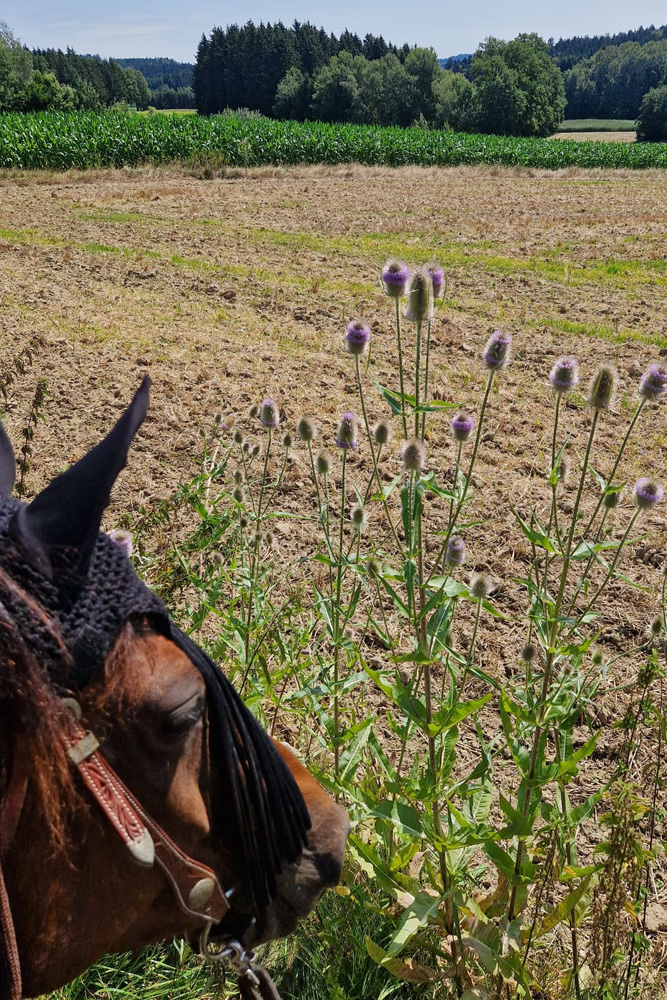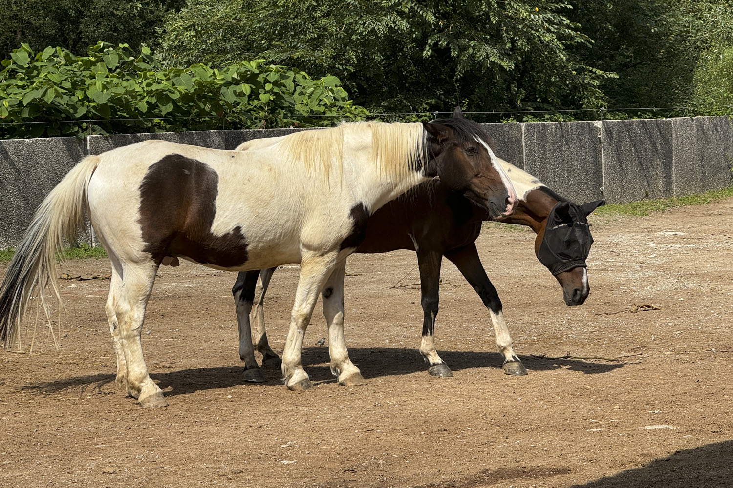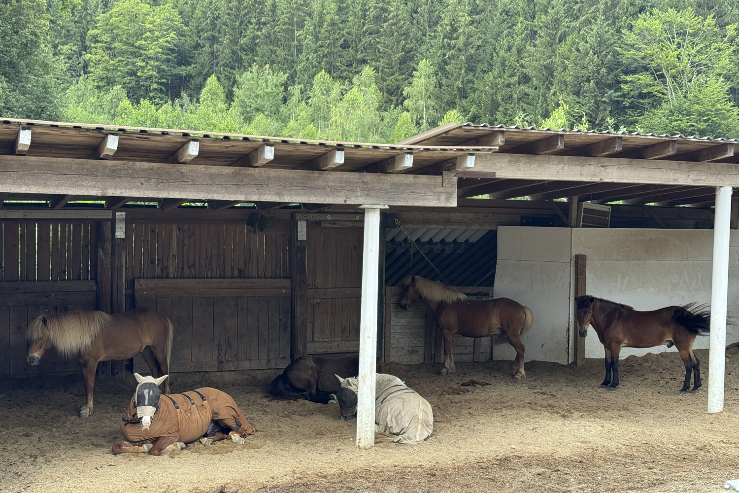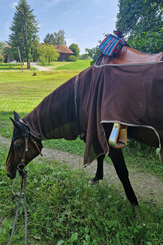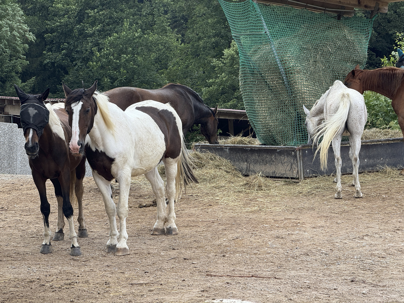 Juli und die Hälfte vom August bescherte warme bis sehr heiße Tage. Ab und zu gab es mal heftige Regenfälle. Leider war das Wetter ideal für so allerlei Stechgetier. Ausritte waren vorwiegend nur mit "Rüstung" und viel Bremsenspray möglich. Ab und zu, wenn die Temperaturen es zuließen tummelten sich auch einige Pferde und ihre Menschen am Reitplatz. Ansonsten wurden eher die Schattenplätze aufgesucht.