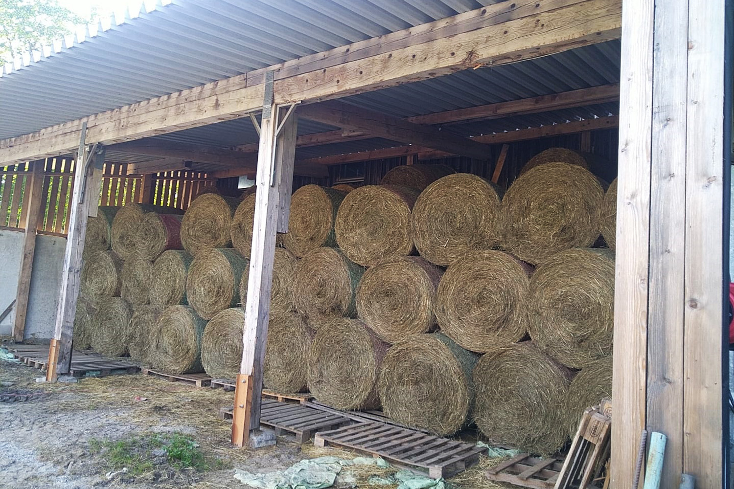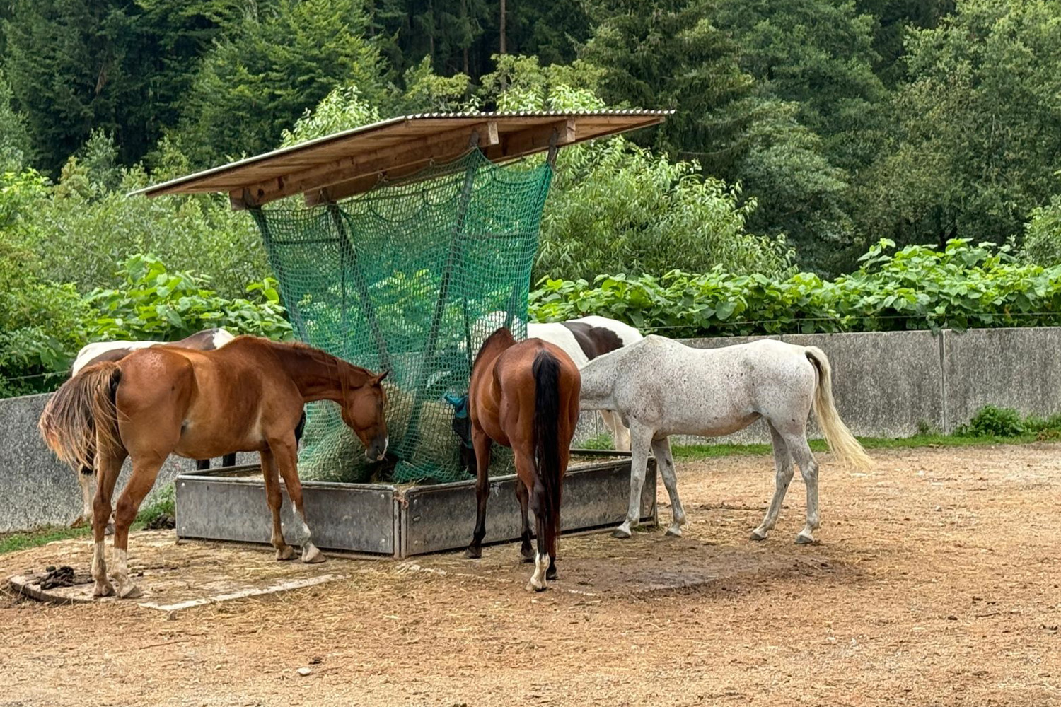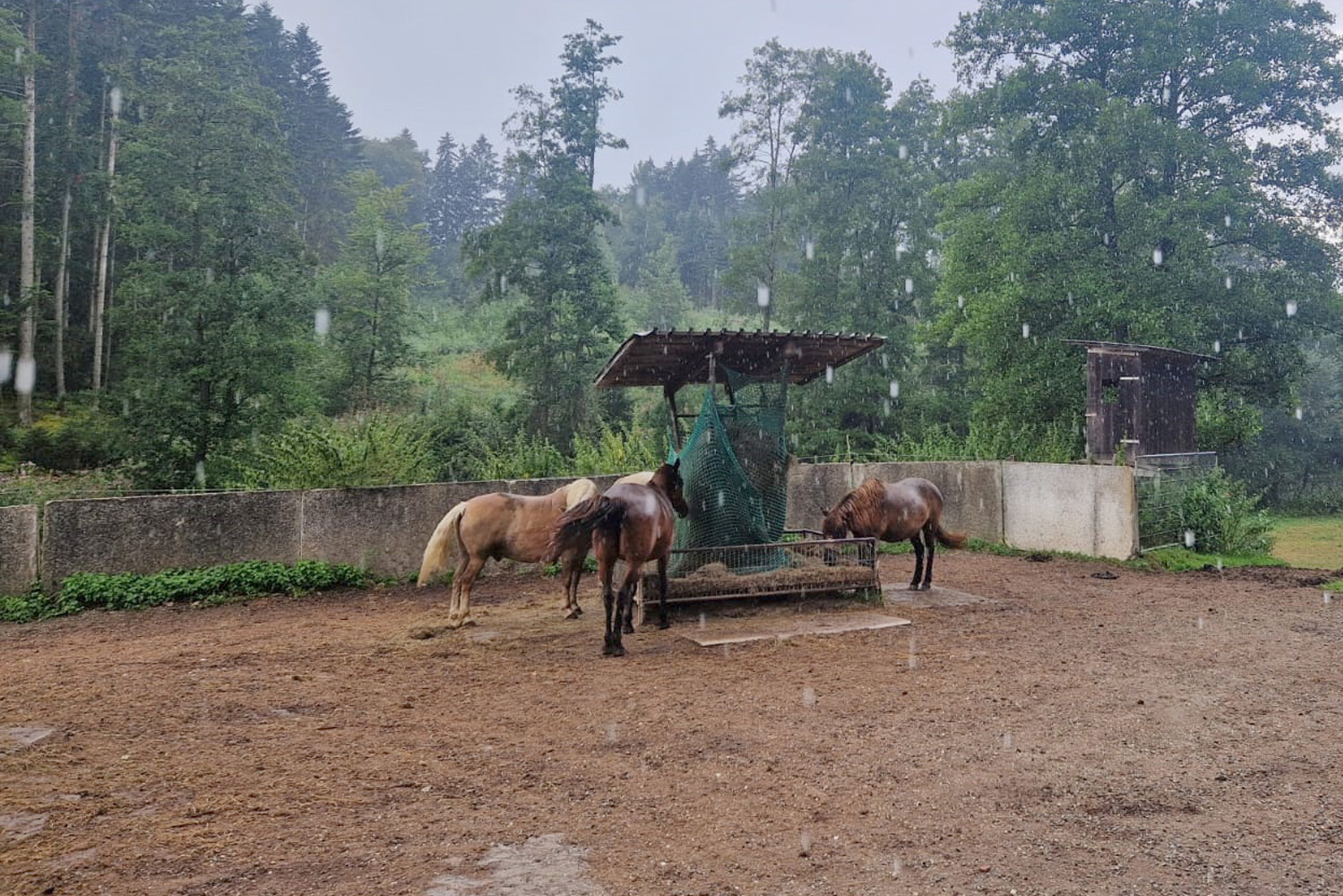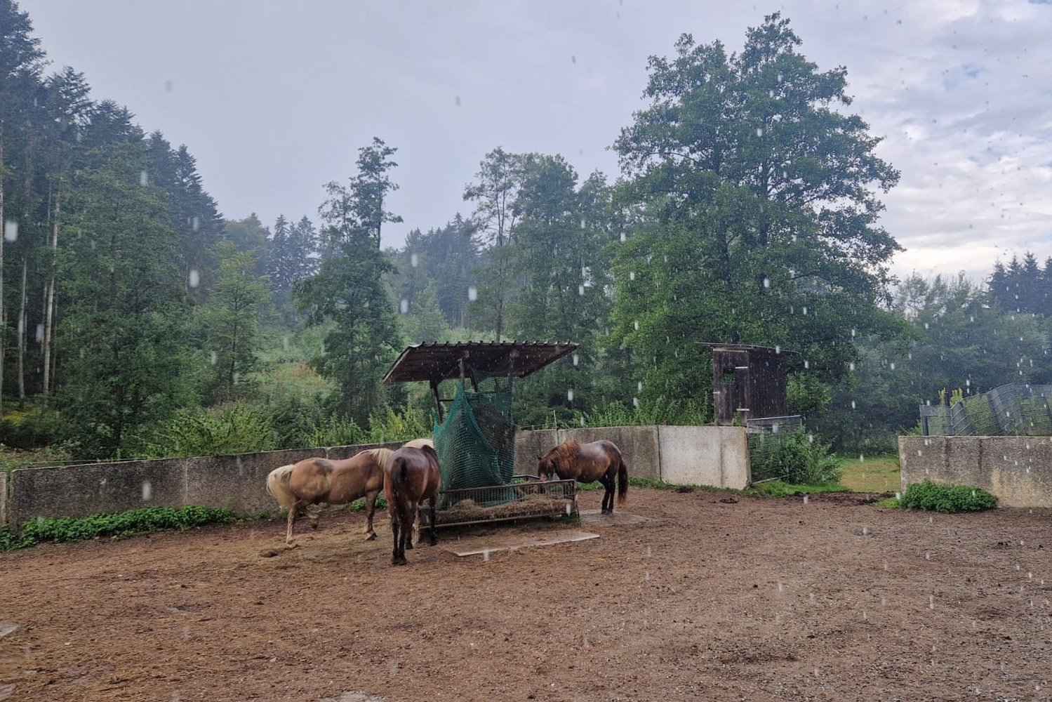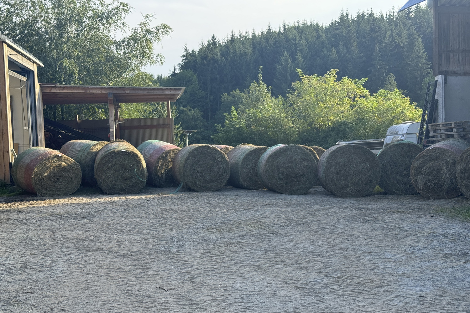 Die erste Heuernte ist erfreulicherweise unter Dach und Fach. 64 Ballen wurden mit viel mechanischem Aufwand herein gebracht. Leider wurden doch auch Ballen abgeduscht, sie wurden dann gewickelt - die Allergiker werden sich dann darüber freuen.