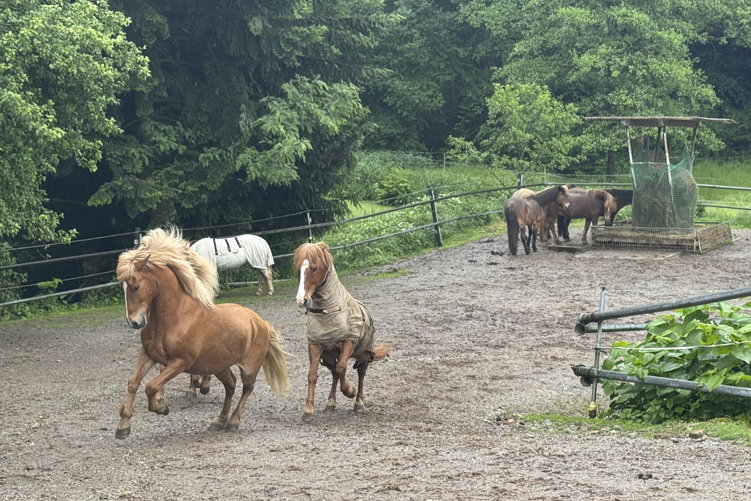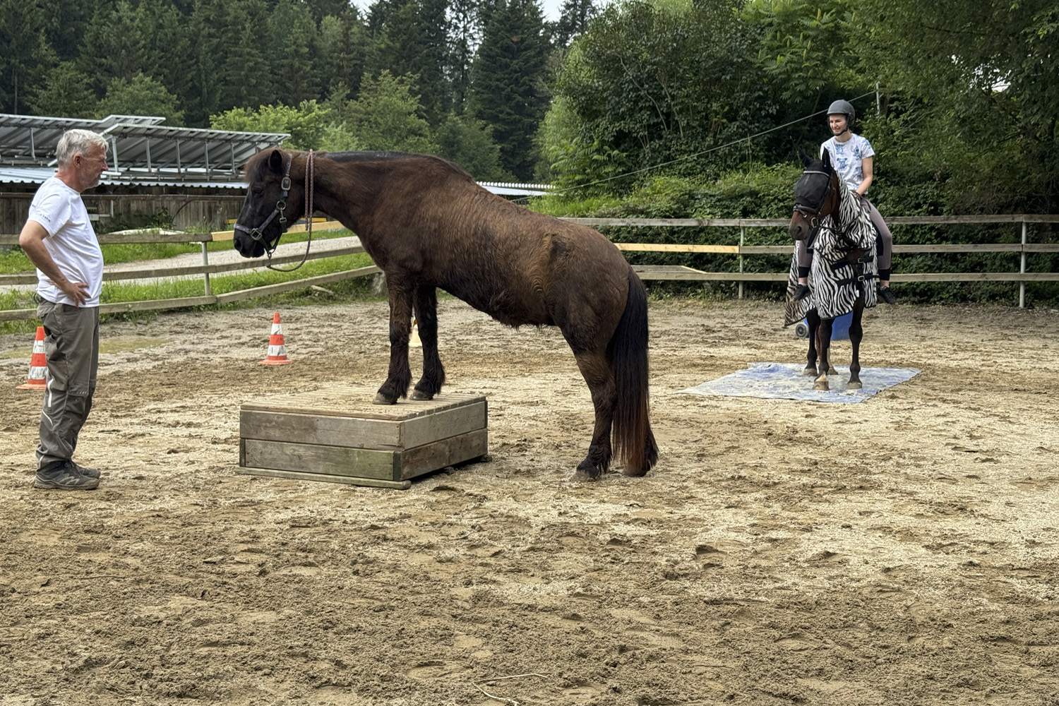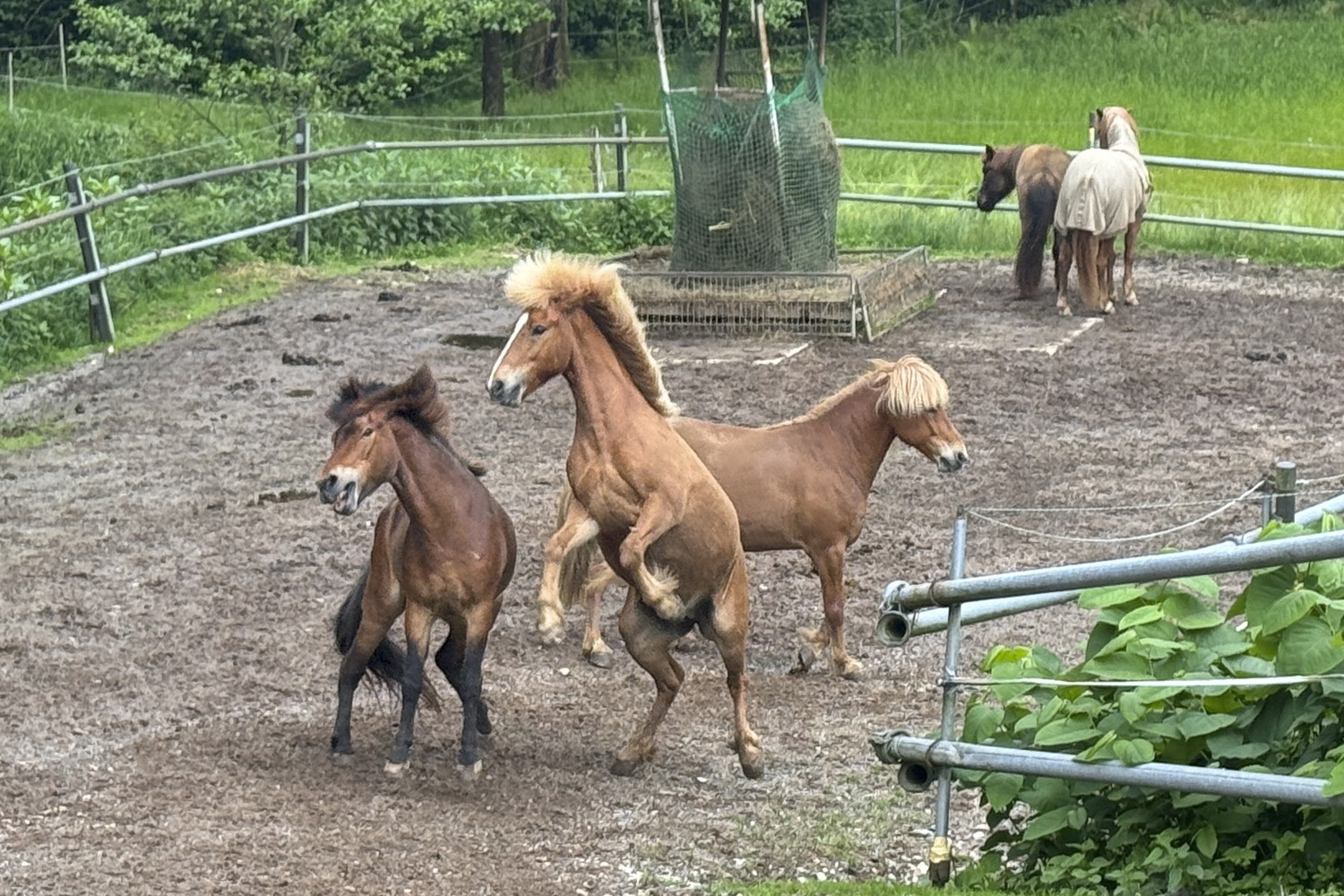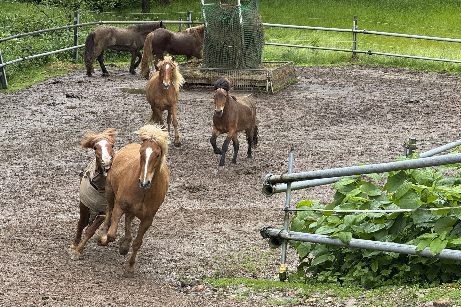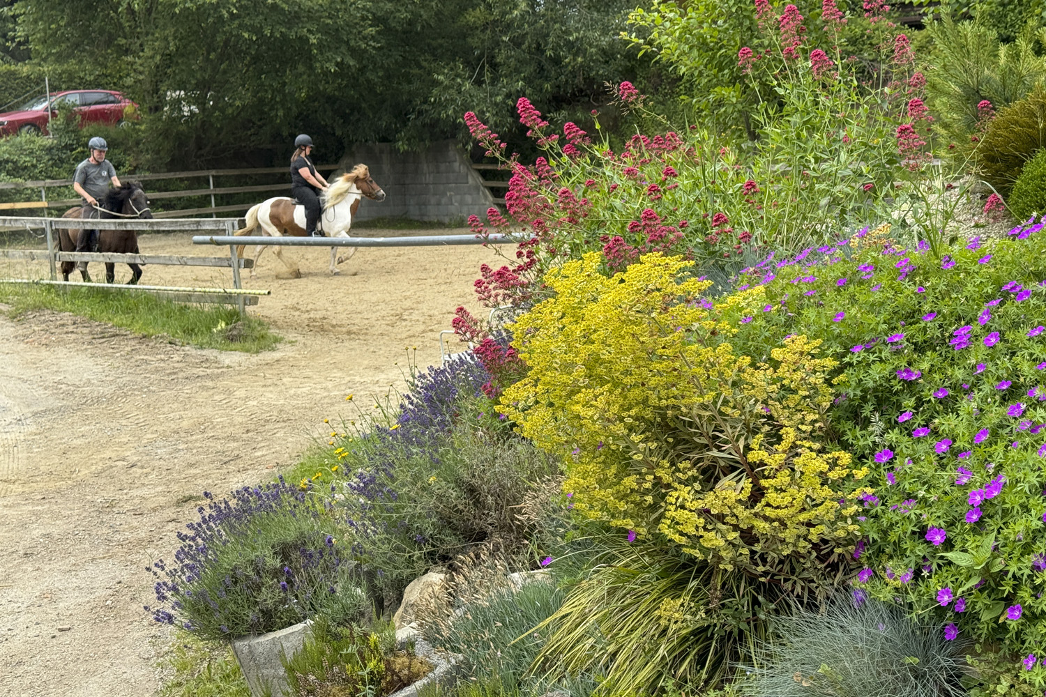 Geschicklichkeit war wieder einmal angesagt und deutlicher Fortschritt war bei denjenigen Pferden festzustellen, die nun schon öfters dabei waren. Das machte natürlich auch den begleitenden Zweibeinern große Freude! Sleipnir fra Ehlers kam in der Isländerherde dazu, nun ist sie mit acht Pferden wieder komplett. Die anfänglichen Rangordnungsdiskussionen waren bald bei gelegt und mittlerweile spielt der Boss Skáti auch mit Sleipnir. Bei einigen Pferden war wieder einmal Kontrolle der Zähne und Raspeln angesagt. Natalie freut sich sehr über ihren neuen Sattel. Der Steingarten beim Reitplatz blüht aktuell prächtig.