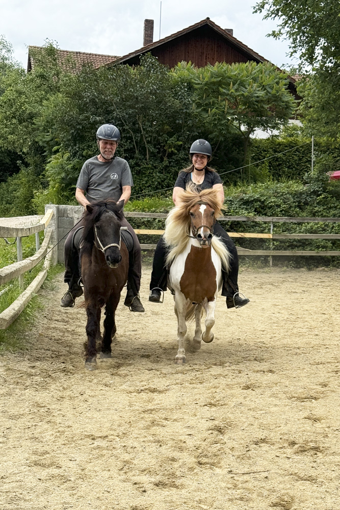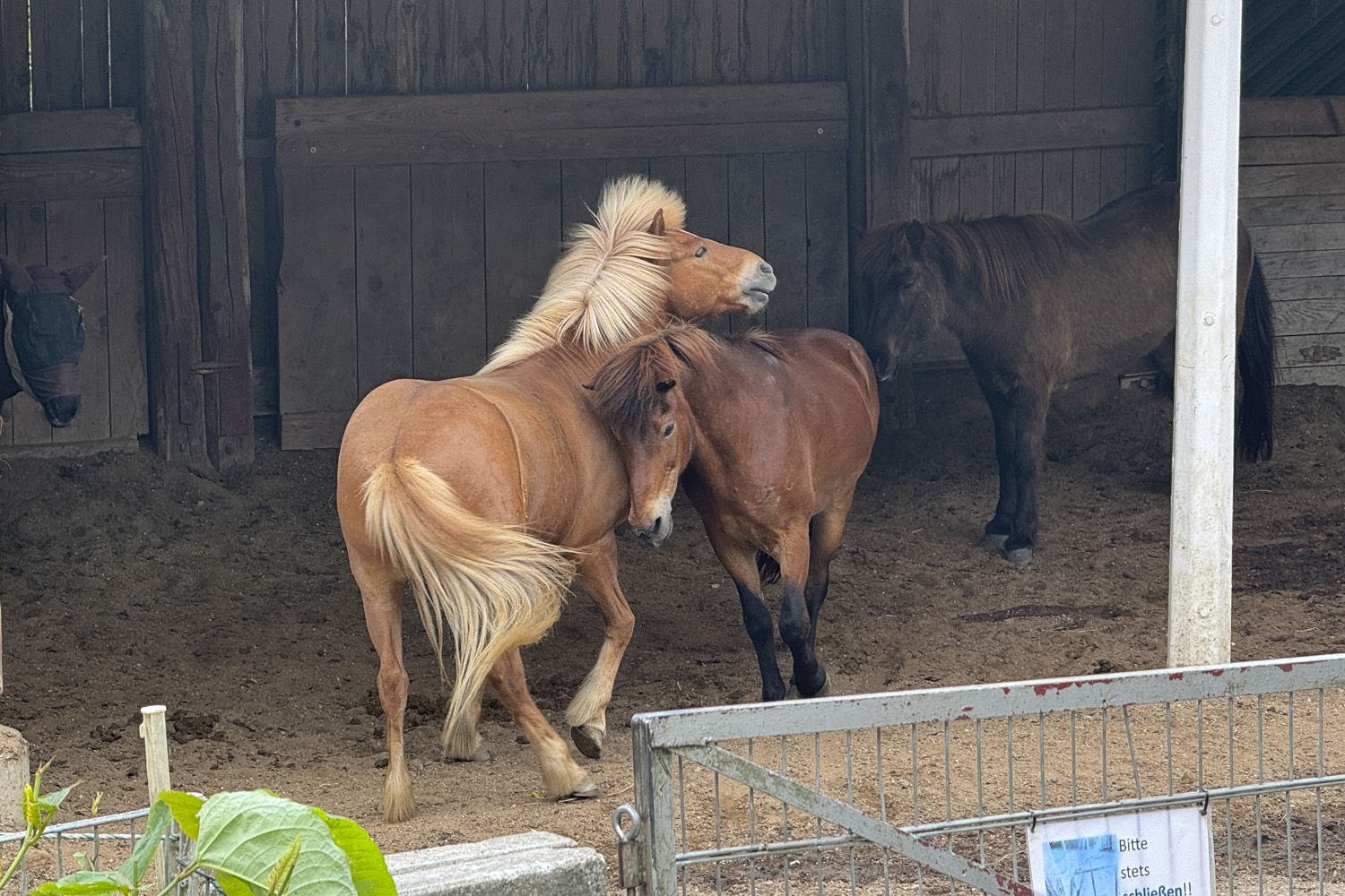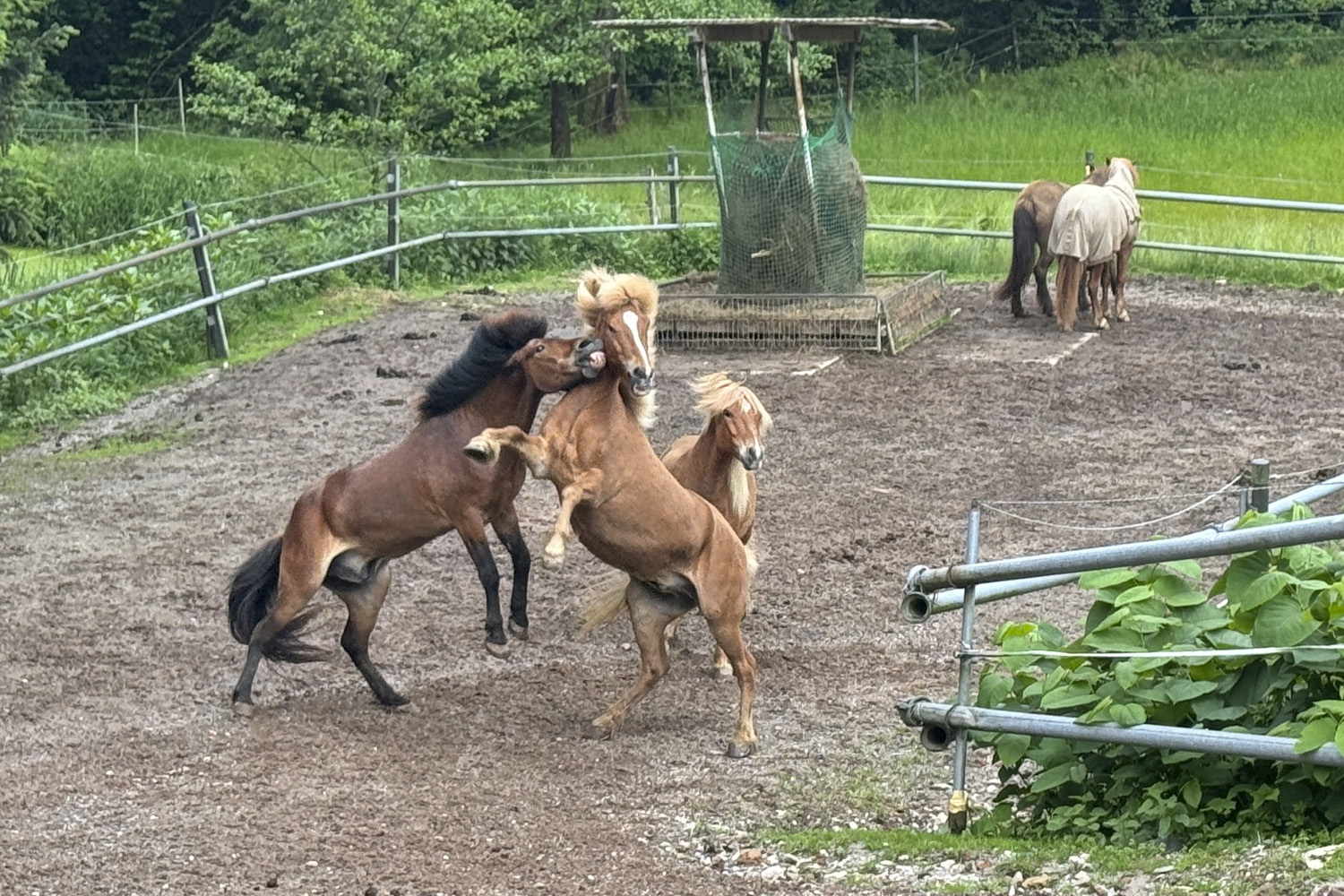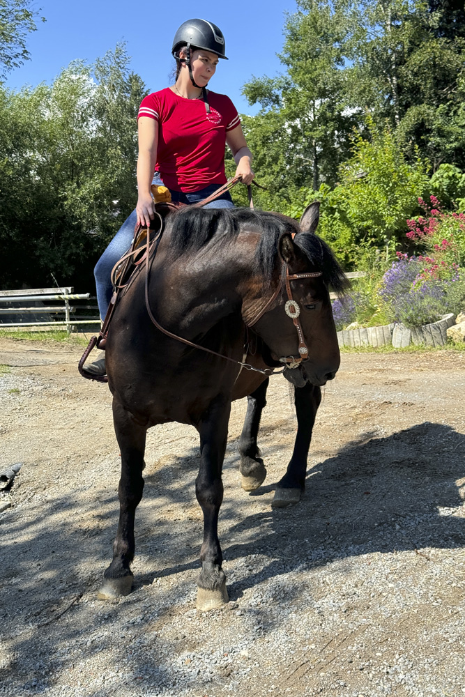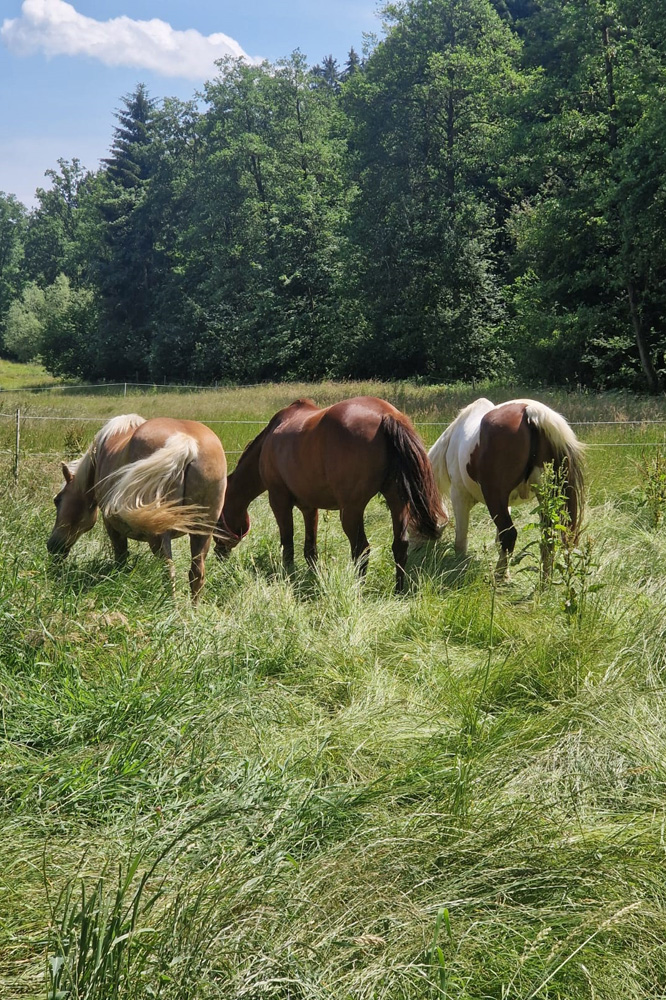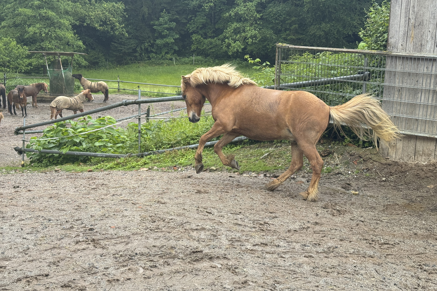 Geschicklichkeit war wieder einmal angesagt und deutlicher Fortschritt war bei denjenigen Pferden festzustellen, die nun schon öfters dabei waren. Das machte natürlich auch den begleitenden Zweibeinern große Freude! Sleipnir fra Ehlers kam in der Isländerherde dazu, nun ist sie mit acht Pferden wieder komplett. Die anfänglichen Rangordnungsdiskussionen waren bald bei gelegt und mittlerweile spielt der Boss Skáti auch mit Sleipnir. Bei einigen Pferden war wieder einmal Kontrolle der Zähne und Raspeln angesagt. Natalie freut sich sehr über ihren neuen Sattel. Der Steingarten beim Reitplatz blüht aktuell prächtig.