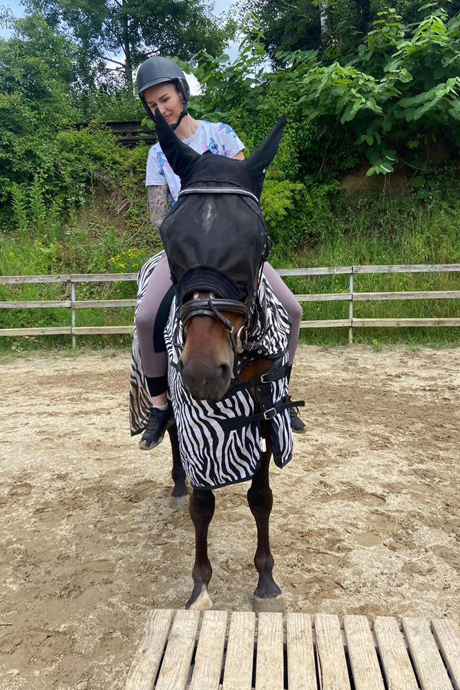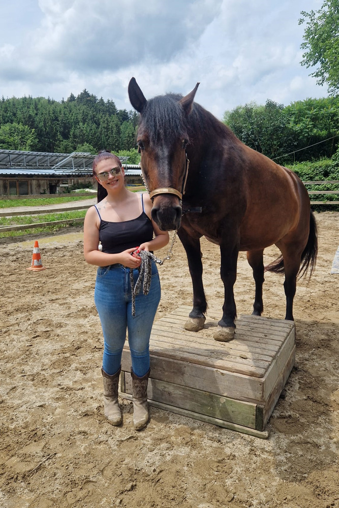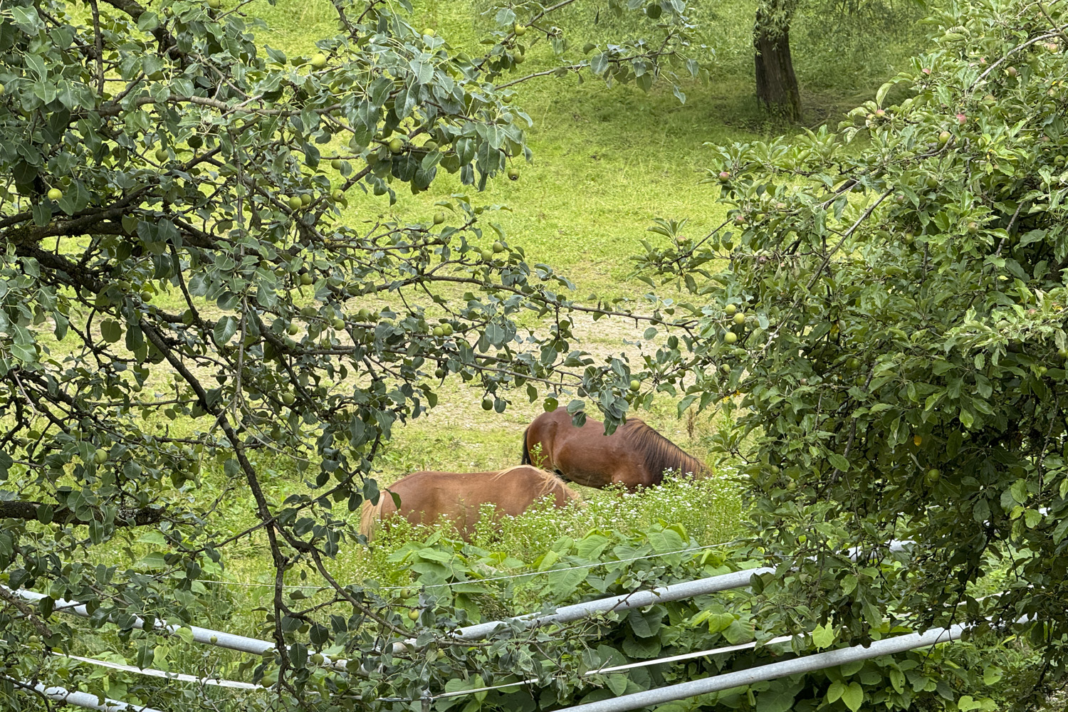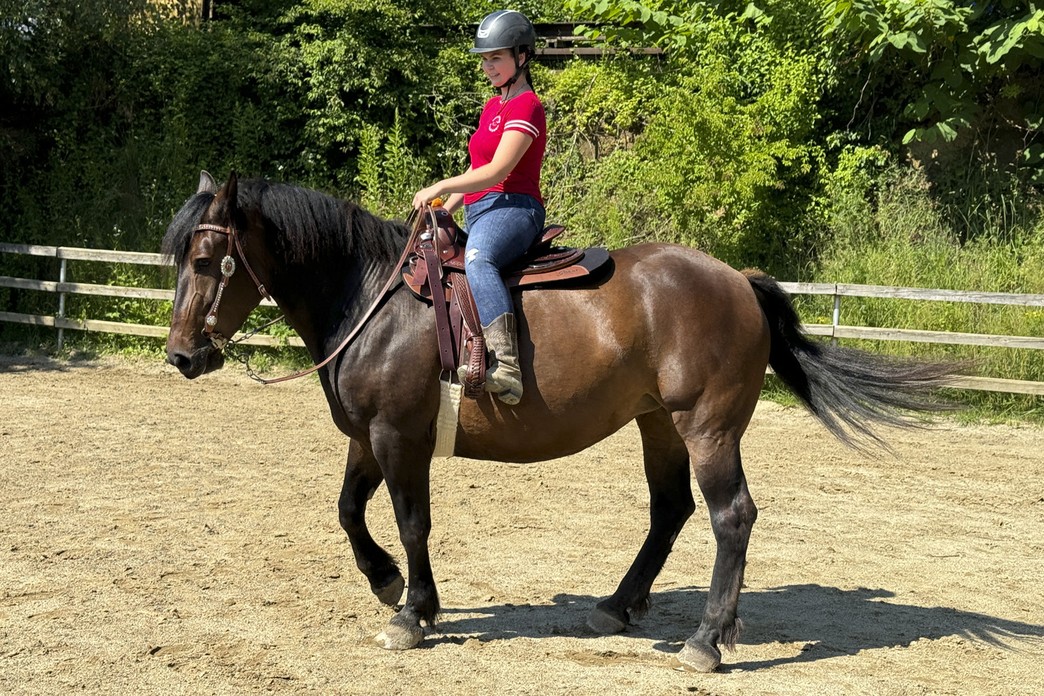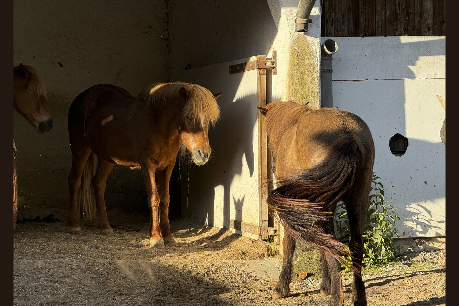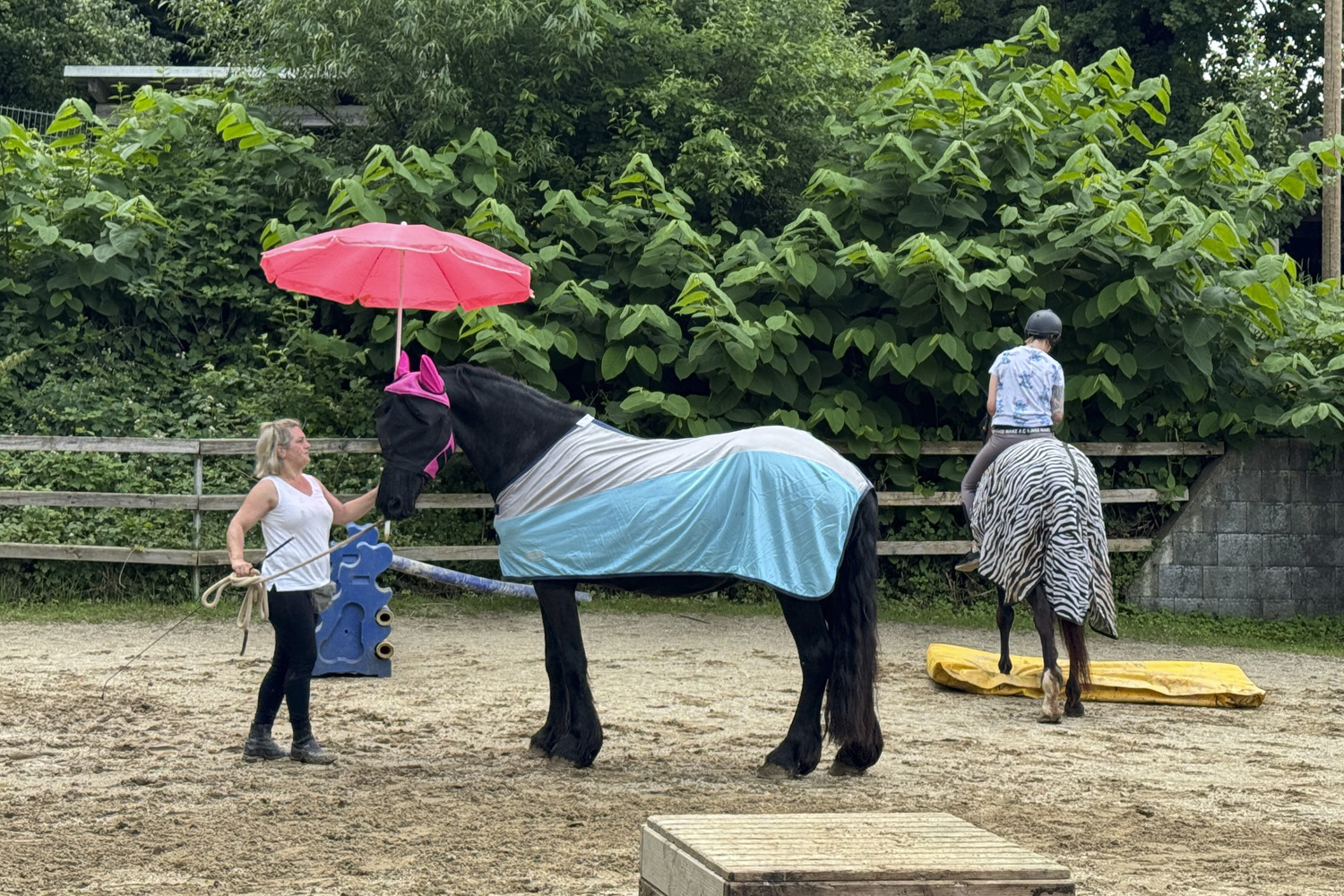 Geschicklichkeit war wieder einmal angesagt und deutlicher Fortschritt war bei denjenigen Pferden festzustellen, die nun schon öfters dabei waren. Das machte natürlich auch den begleitenden Zweibeinern große Freude! Sleipnir fra Ehlers kam in der Isländerherde dazu, nun ist sie mit acht Pferden wieder komplett. Die anfänglichen Rangordnungsdiskussionen waren bald bei gelegt und mittlerweile spielt der Boss Skáti auch mit Sleipnir. Bei einigen Pferden war wieder einmal Kontrolle der Zähne und Raspeln angesagt. Natalie freut sich sehr über ihren neuen Sattel. Der Steingarten beim Reitplatz blüht aktuell prächtig.