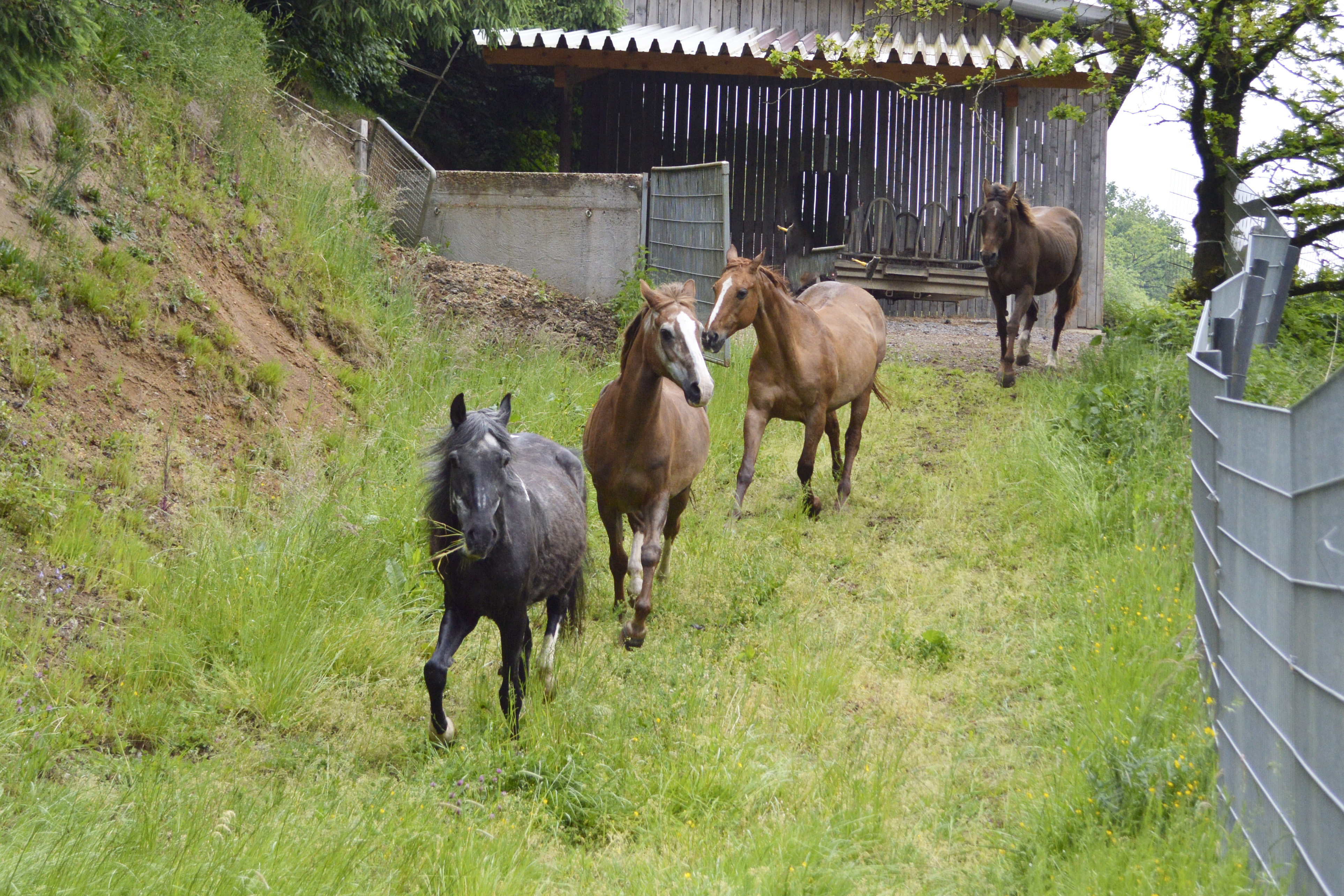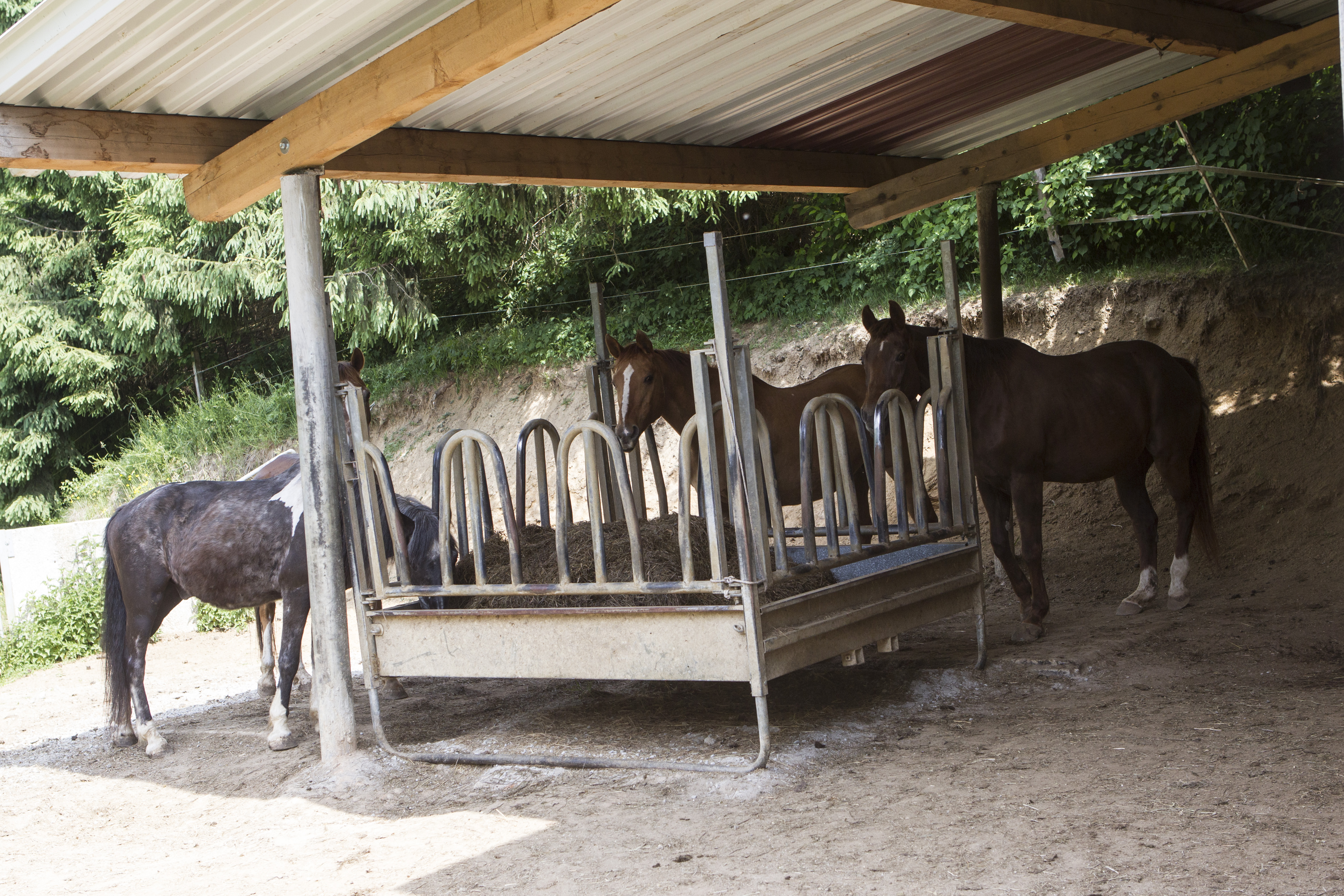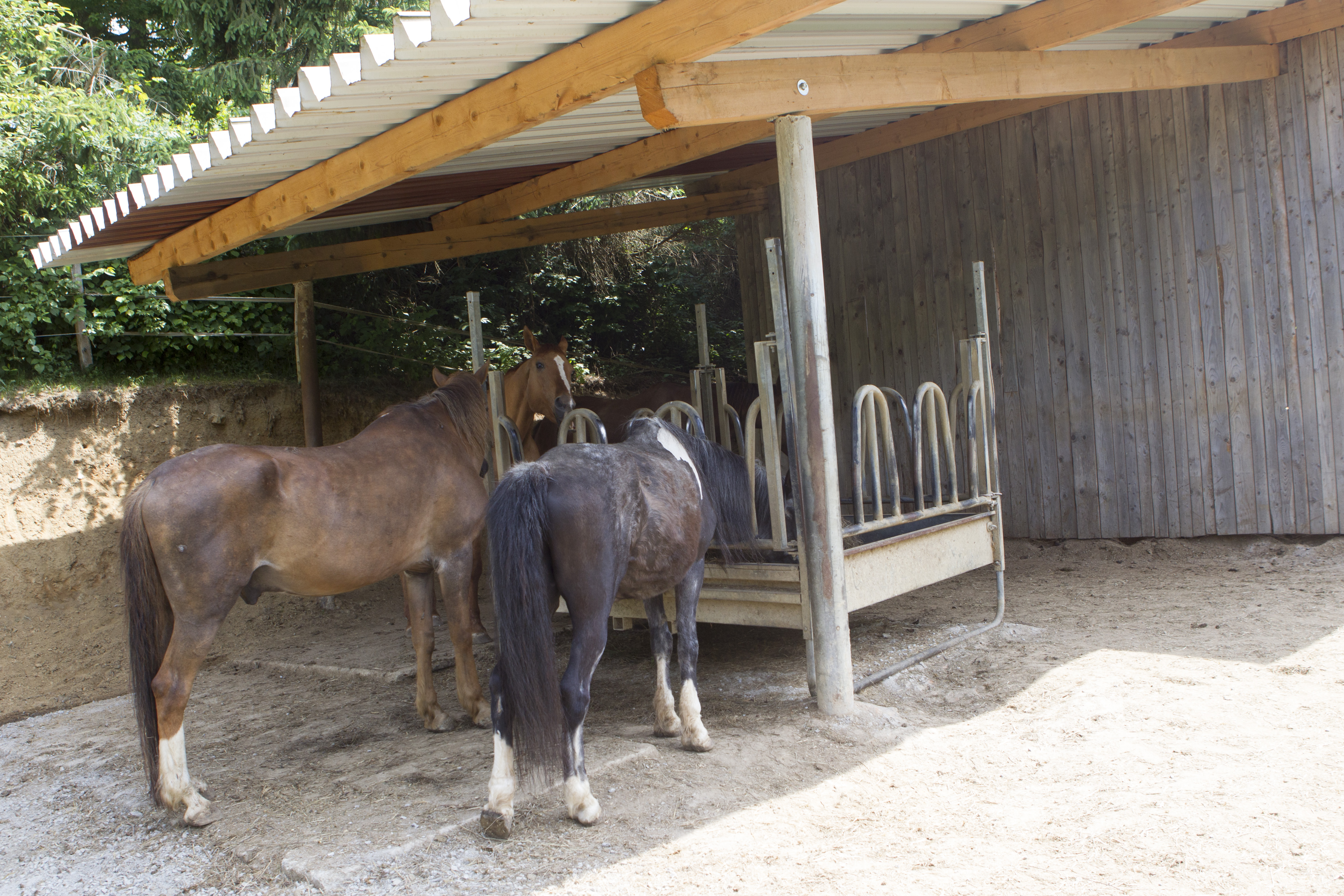 Die kleinste Gruppe ist die Gruppe der Senioren. Sie besteht seit April/Mai 2025. Insgesamt ist Platz für ca. vier Pferde. Der Paddock verfügt über eine sehr komfortable große Rückzugs- und Ruhehalle. Dahinter befindet sich die Futterraufe. Die Senioren bekommen halbierte Heulageballen ohne Netz.